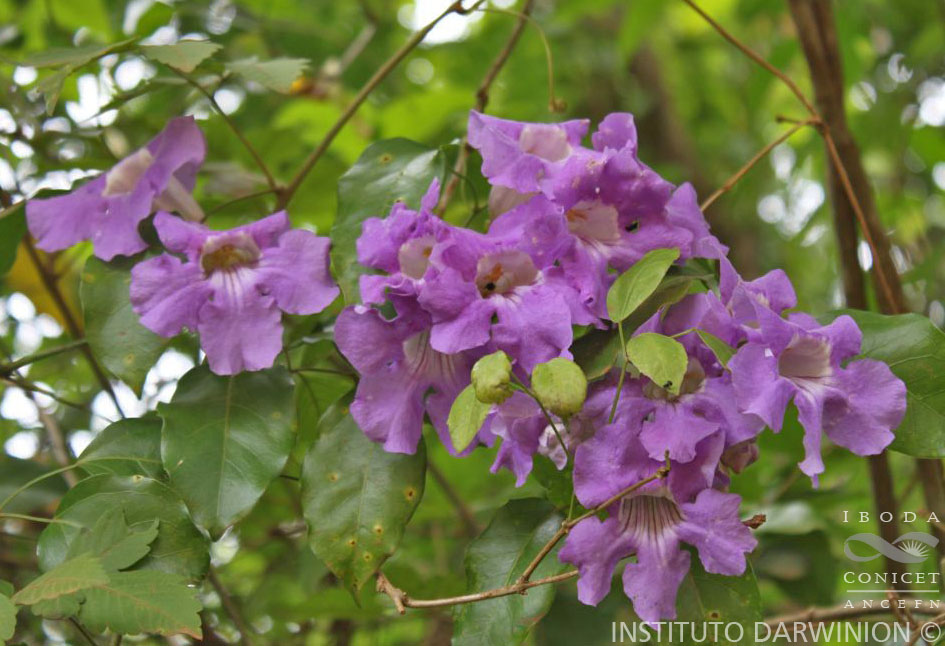 Trepadora leñosa de 4-6 m de alto, ramas longitudinalmente estriadas con lenticelas elípticas, de 0,5-1,2 mm de largo, nudos sin campos glandulares, con pliegue interpeciolar crestado; profilos de las yemas axilares triangular-ovados, agudos, de 1,5-2 mm de largo. Hojas 2-3-folioladas o con zarcillo terminal trifilamentado, pecíolo de 1,4-3,5 cm de largo, peciólulos de 9- 25 mm de largo, glabros, canaliculados en la haz; folíolos cartáceos, ovados o elípticos, de 5,5-10 × 2,5-6,3 cm, borde entero, glabros, ápice acuminado, haz lustrosa, venación pinada, las 2 primeras venas secundarias naciendo en la base, venación menor visible en ambas caras, envés opaco, con escamas dispersas, nectarios pequeños en la base, cerca de la vena media, sin domacios. Inflorescencia axilar en racimos, brácteas de 2 mm de largo. Flores perfumadas, pedicelos de 0,9-2,1 cm de largo, bractéolas sésiles, subuladas, de 11-12 mm de largo; cáliz turbinado, glabro, de 6-8 × 5-7 mm de largo, superficie verrucosa, con 5 aristas proyectadas en dientes cortos, a veces irregularmente lobado, o el borde apenas denticulado, pubérulo; corola tubuloso-acampanada, base angosta, violácea o morada, interior blanco con estrías purpúreas, de 6,5-7,5 × 4,2-6 cm, glabra, lóbulos de 13-25 mm de diám.; estambres inclusos, conectivo obtuso o agudo, tecas rectas, opuestas, de 3-3,5 mm de largo; ovario cilíndrico, de 2,5 mm de largo, disco cupular, de 1 mm de largo. Cápsulas linear-oblongas, de 18-25 × 1,2-2 cm, leñosas, pardas u oscuras, valvas convexas, notoriamente estriadas. Semillas de contorno elíptico, de 1-2 × 4-5,5 cm, cuerpo grueso, oscuro, alas laterales hialinas.