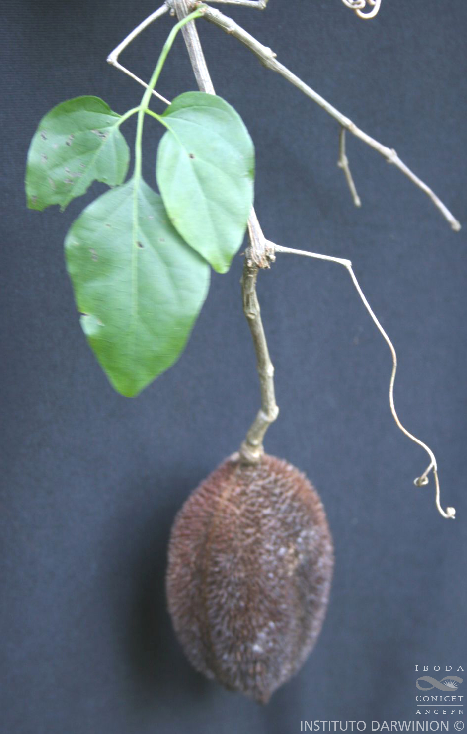 Liana de 3-10 m de alto. Ramas jóvenes pubérulas a tomentosas o villosas, con tricomas simples uniseriados, nudos con líneas interpeciolares villosas. Hojas 2-3- folioladas; pecíolo de 1,5-5 cm de largo; peciólulos de 0,7-5 cm de largo; folíolos anchamente ovados, a veces suborbiculares, base cordada, de 4-14 × 3-11 cm, acuminados, glabros y lustrosos o pilosos, envés sin domacios, con nectarios dispersos de 0,2-0,3 mm de diám. Zarcillo terminal trifilamentado. Racimo bracteoso, de 10-20 cm de largo; brácteas elípticas, de 7-14 × 2-2,5 mm y bractéolas elípticas de 4-6 mm de largo, laxamente pilosas. Cáliz poculiforme truncado, tomentoso, de 7-8 × 9-10 mm, la parte superior con nectarios discoideos, oscuros, de 0,2 mm de diám.; corola blanco-cremosa, acodada, de 4-6,5 × 3-4,5 cm, angostamente tubulosa en la base, luego campanulada, tomentosa por fuera excepto en la porción basal, garganta amarilla, los lóbulos inferiores más desarrollados, cara interna glabra excepto en los bordes; estambres inclusos, adosados a la cara superior del tubo corolino, anteras con tecas divergentes, de 3-3,5 mm de largo; disco carnoso, ovario ovoide, tomentoso, de 4-5 mm de largo. Cápsulas leñosas, de 13-20 × 5-7 × 2-3 cm, con un apéndice apical cilíndrico, obtuso, de 10-15 × 5-6 mm, valvas de 1,6-2 mm de espesor, cubiertas de púas subuladas, fuertes, de 2-5 × 2-7 mm. Semillas de contorno elíptico, de 2,5-3,5 × 3,5-7 cm, con cuerpo ovado y ala transparente, amplia.