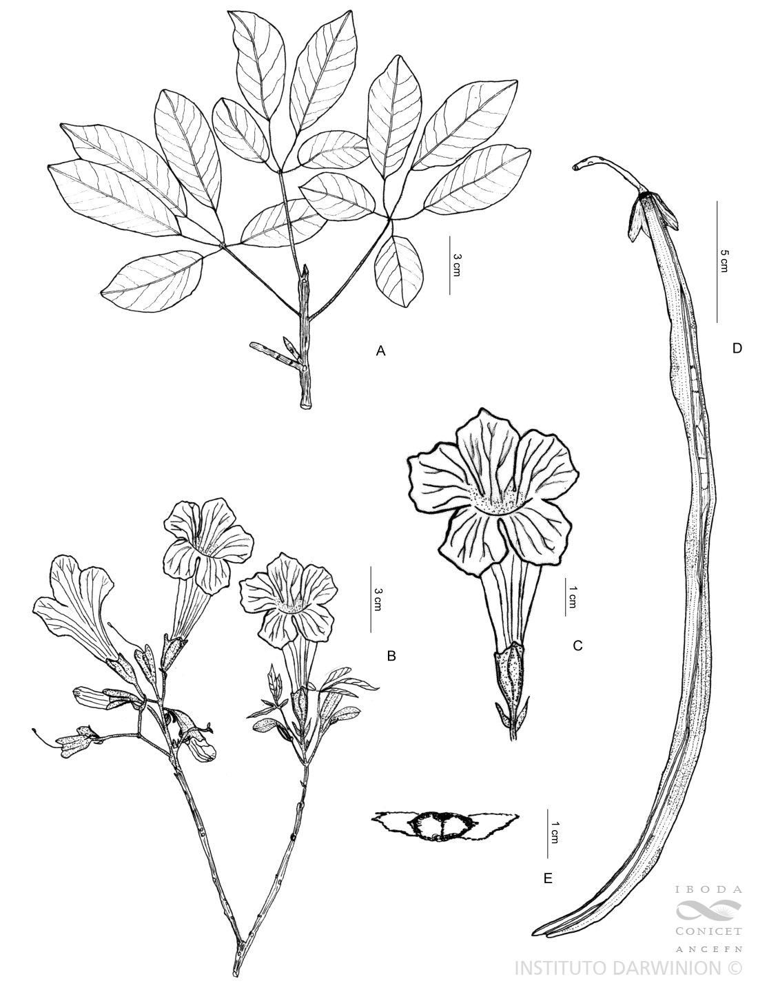 Árbol hasta de 30 m de alto, tronco hasta 70 cm de diám., corteza en placas. Hojas palmaticompuestas; pecíolo de 4,5- 8,5 cm de largo; peciólulos de 7-41 mm de largo, pulvinulados en la unión con la lámina; folíolos 5-7 elípticos, ovados u obovados, enteros, de 9-11,7 × 3-6,3 cm, cartáceos, base cuneada, redondeada o algo acorazonada, ápice agudo, acuminado u obtuso, cuando jóvenes marcadamente discoloros, envés blanco-tomentoso; folíolos adultos laxamente escamosos, tricomas porrecto-estrellados caducos, tricomas estrellados cortos, con nectarios discoideos salpicados, envés con domacios y venación menor visible. Tirsos laxos o contraídos, plurifloros, terminales; brácteas y bractéolas caducas, de 3-5 mm de largo. Cáliz tubuloso o turbinado, lanoso, de 10,5-20 × 4-9 mm, tricomas dendroides de 0,3-0,8(-1.5) mm de largo, a veces con nectarios oscuros de 0,3 mm de diám. hacia el ápice, 3-5 lóbulos con lados convexos, ápice agudo u obtuso, a veces con áreas glabrescentes entre las venas principales; corola amarillo- oro, por dentro con líneas rojizas, de 45-70 mm de largo, con tricomas porrecto-estrellados salpicados sobre las venas en la parte superior; anteras con tecas divaricadas de 3 mm de largo, disco de 1 mm de largo, ovario cilíndrico de 5 mm de largo. Cápsulas lineares, de 21-30 × 0,8-1,4 cm, glabrescentes. Semillas de 4-5 × 14-18 mm, alas hialinas.