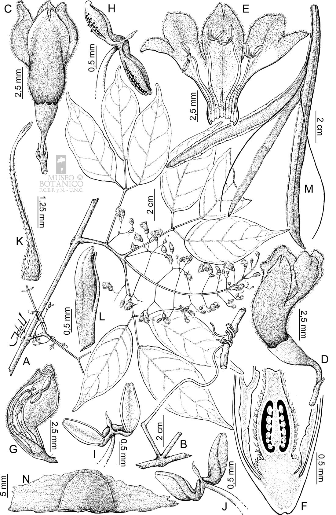 Liana hasta de 6 m de alto, ramas con lenticelas circulares o elípticas de 3-9 mm de largo, nudos sin campos glandulares ni línea interpeciolar; profilos de las yemas axilares inconspicuos. Hojas bi-trifolioladas; pecíolo de 1,7-4 cm de largo, peciólulos de 1-2,5 cm de largo, ambos canaliculados, haz pubérula; folíolos elípticos u ovados, de 4-10,5 × 1,5-4 cm, papiráceos, acuminados, borde entero, glabros, escamas escasas, envés con domacios pequeños, venación menor visible en ambas caras; zarcillo terminal trifilamentado, ápices uncinados. Inflorescencia en tirso apical o axilar laxo; brácteas triangulares, de 5-15 mm de largo. Flores con pedicelos escamosos de 2,5-4 mm de largo; bractéolas sésiles de 0,4-0,5 mm de largo; cáliz turbinado, denticulado, deciduo de 1,5-2,2 mm de largo, glabro; corola tubulosa, curvada, blanquecina de 5-9 × 5-7,5 mm, tomentosa, porción apical separada en dos labios, el superior formado por 2 lóbulos soldados casi hasta el ápice, glabro por dentro, el inferior con 3 lóbulos tomentosos en ambas caras; estambres inclusos, conectivo apiculado, tecas recurvadas ascendentes; disco anular, ovario ovoide ca. 1 mm de largo, densamente pubescente. Cápsulas lineares, complanadas, de 13-18,5 × 0,8-1,6 cm, lignificadas, castaño oscuras, ligeramente rugosas, ápice agudo, alas de 3-5 mm de ancho. Semillas de contorno elíptico, de 0,8-1 × 2,7-3,7 cm, planas, delgadas, alas membranáceas.