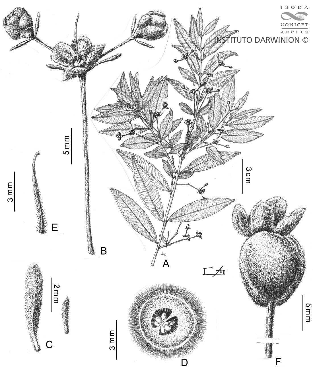 Árbol o arbolito de 2-8 (15) m. Hojas de 2-9 x 0,7-2 cm, elípticas; epifilo glabro o algo pubescente sobre el nervio medio, hipofilo glabrescente a la madurez. Flores 1-7, en dicasios; pedúnculos de 1-4 cm; hipanto seríceo, pubescente sobre la pared locular; sépalos seríceos; pétalos pubescentes; estambres de 5-8 mm; disco estaminal pubescente; estilo pubescente de 5-9 mm. Fruto hasta 1,5 cm, globoso, rojo, piloso.