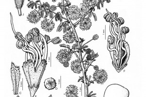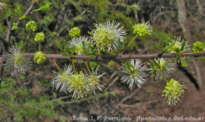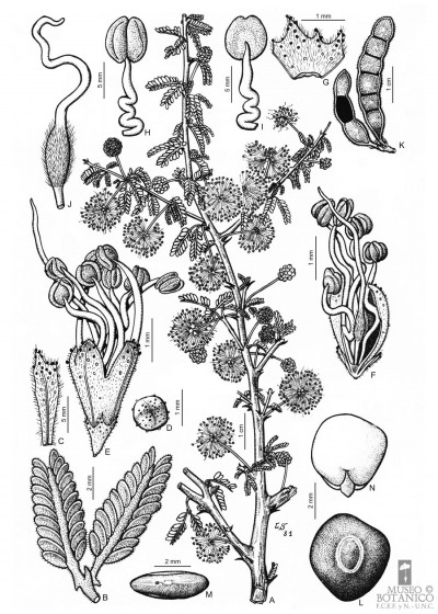 Arbustos y arbolitos caducifolios, alcanzando hasta 3 m de alt. Indumento de glándulas sésiles, excepto las ramas anotinas, que son glabras. Tallos con acúleos infraestipulares, ±rectos. Hojas y capítulos emergiendo desde braquiblastos. Hojas con estípulas de 1-3 mm long., 2-3-nervadas, caducas; pinnas 1-par; raquis foliar de 0,5-1,6 cm; folíolos 5-12-pares, de 2,2-4,5 x 0,8-1,7 mm, pubérulos en el envés o en ambas caras, con glándulas sésiles en el margen o en las caras, 2-3-nervados, ±discoloros en material de herbario. Inflorescencias con pedúnculos de 0,4-25 mm long.; capítulos de 4,5-5 mm diám., esferoides. Flores fértiles diplostémonas, con cáliz de 0,5-1 mm long.; corola de 2-3 mm, pubérula, blanquecina. Craspedios de 2,2-5,5 x 0,4-0,8 cm, pubérulos, glandulosos, castaños en herbario.