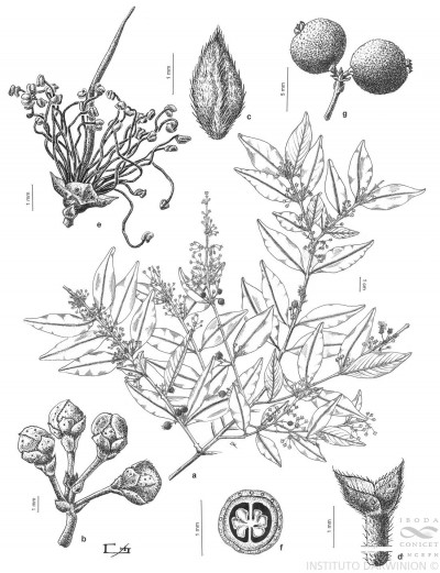 Árbol o arbusto glabro o con escasa pubescencia sobre las piezas florales. Hojas pecioladas, de lámina membranácea o subcoriácea, glabra, elíptica angosta hasta ancha, con base cuneada y brevemente acuminada, 2-6 mm long. x 1,4-2,8 cm lat.; pecíolo pubérulo, 3-5 mm long. Inflorescencias racemosas con 2-7 flores; eje 5-13 mm long. Bractéolas persistentes, anchamente ovadas, 1-1,5 mm long., cilioladas, con algunos pelos a lo largo de la vena media. Sépalos ciliolados, ovados, de ápice agudo y base muy ancha, 1-1,5 mm long. Pétalos ovales, 3-3,5 mm long. Estambres 4,5-6,5 mm long. Hipanto glabro. Estilo glabro, 5-8 mm long. Fruto violáceo, globoso o sub-globoso, 0,5-1,5 cm de diámetro.