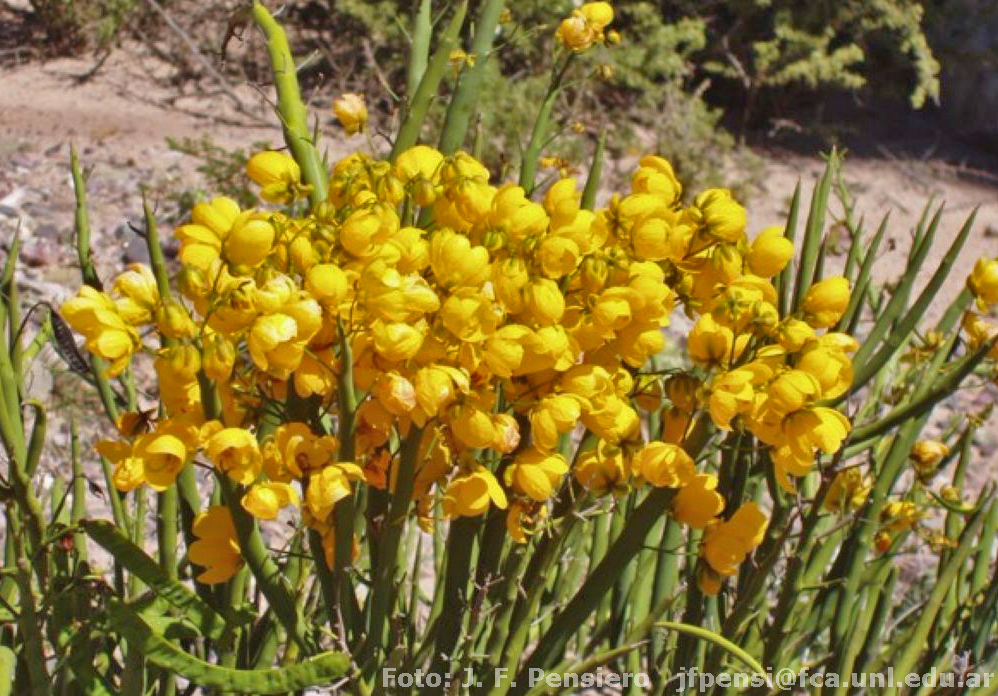 Arbusto robusto, 0,3 – 2 m alt., ramas glabras terminadas en espinas, gruesas, rígidas, 0,3-0,9 cm diám., fastigiadas, con ángulo de divergencia de las ramas de 10º-50º, áfilas, estípulas ausentes. Inflorescencia en racimos corimbosos simples 2-floros ; cáliz con sépalos obovados, 2 menores y 3 mayores, (medidas ?) ; corola con pétalos (forma) , 12-27 mm long. x 8 – 13 mm lat. Grupo de estambres mayores con uno de ellos opuesto al gineceo, curvo, glabro, de 14 – 18 mm long (mejorar esta descrip.). Legumbre glabra, algo curvada, apenas mucronulada de 11-14 cm long x 0,8 cm lat. Semillas 25 - 30 con sus caras más anchas paralelas a las valvas del fruto.