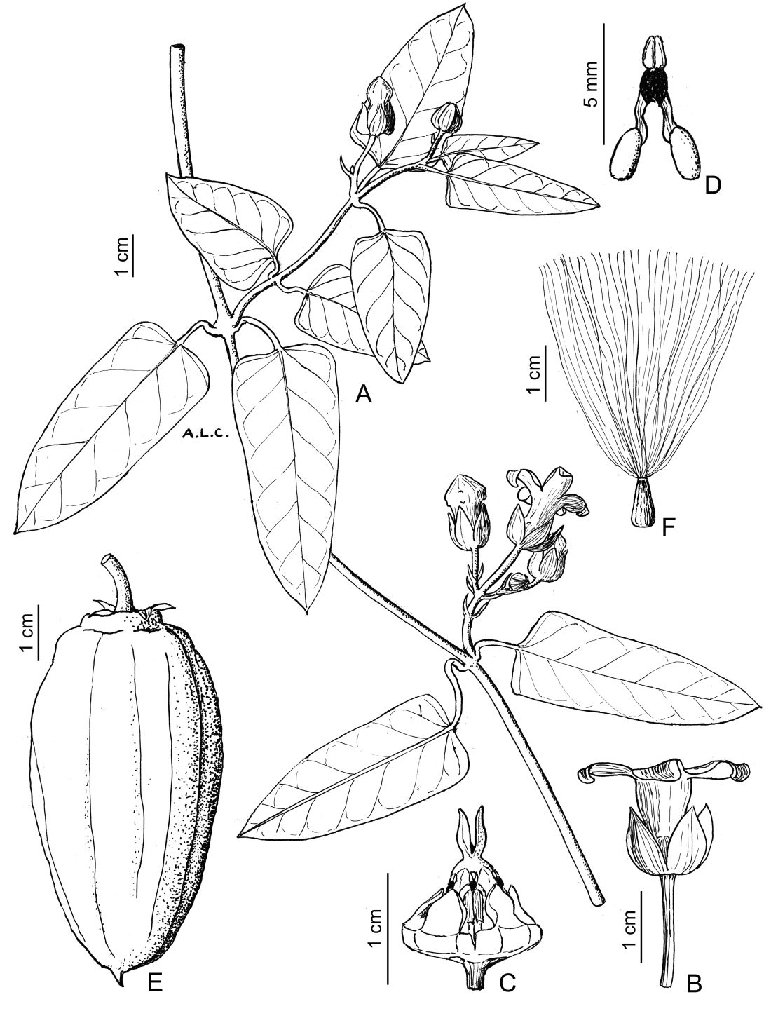 Voluble, ramas de 5-8 m de alto, con tricomas adpresos, retrorsos. Hojas con peciolo de 1-3 cm de largo; láminas inferiores oblongo-ovadas, las superiores oblongas, de 4-12 × 1,5-4 cm, base brevemente cordada a truncada, superficie abaxial albo-tomentosa, superficie adaxial glabra, margen liso. Cimas umbeliformes, 2-5-floras, pedúnculo de 5-10(-15) mm de largo, albo-tomentoso. Flores con pedicelo de 9-16 mm de largo, albo-tomentoso; cáliz con lóbulos ovados a lanceolados, de 8-14 × 5-7,5 mm, ápice agudo, pubérulos, no reflexos, sin coléteres en los senos; corola subtubulosa con base ventricosa, superficie externa blanca, superficie interna blanca, violácea, rojiza o rosada, tubo de 7-13 mm de largo, lóbulos ovado-triangulares, de 3-10 × 4-7 mm, erectos o recurvados, finamente pubescentes en la cara abaxial; corona blanca, 5-lobada, de 2-5 mm de largo, con lóbulos que cubren sólo parte de las anteras; ginostegio subsésil de 3-4 mm de alto; anteras con membrana apical suborbicular, glabra; apéndice de la cabeza estilar amarillo o blanquecino, 2-partido en el ápice, incluso en la corola, pero exerto de la corona; retináculo subovoide de 0,6-0,65 × 0,35 mm, ápice con apéndice subhialino, caudículas descendentes, de 0,65 mm de largo, dilatadas cerca de los polinios, polinios ovoides y oblicuos de 0,9-1,2 × 0,45 mm. Folículos ovoides, de 12-15 × 5-7,5 cm, de superficie lisa o longitudinalmente acanalada. Semillas 1050-1100, obovadas, de 6-7 × 3-4 mm, ápice truncado, superficie verrucosa; penacho de pelos de 3-5 cm de largo.