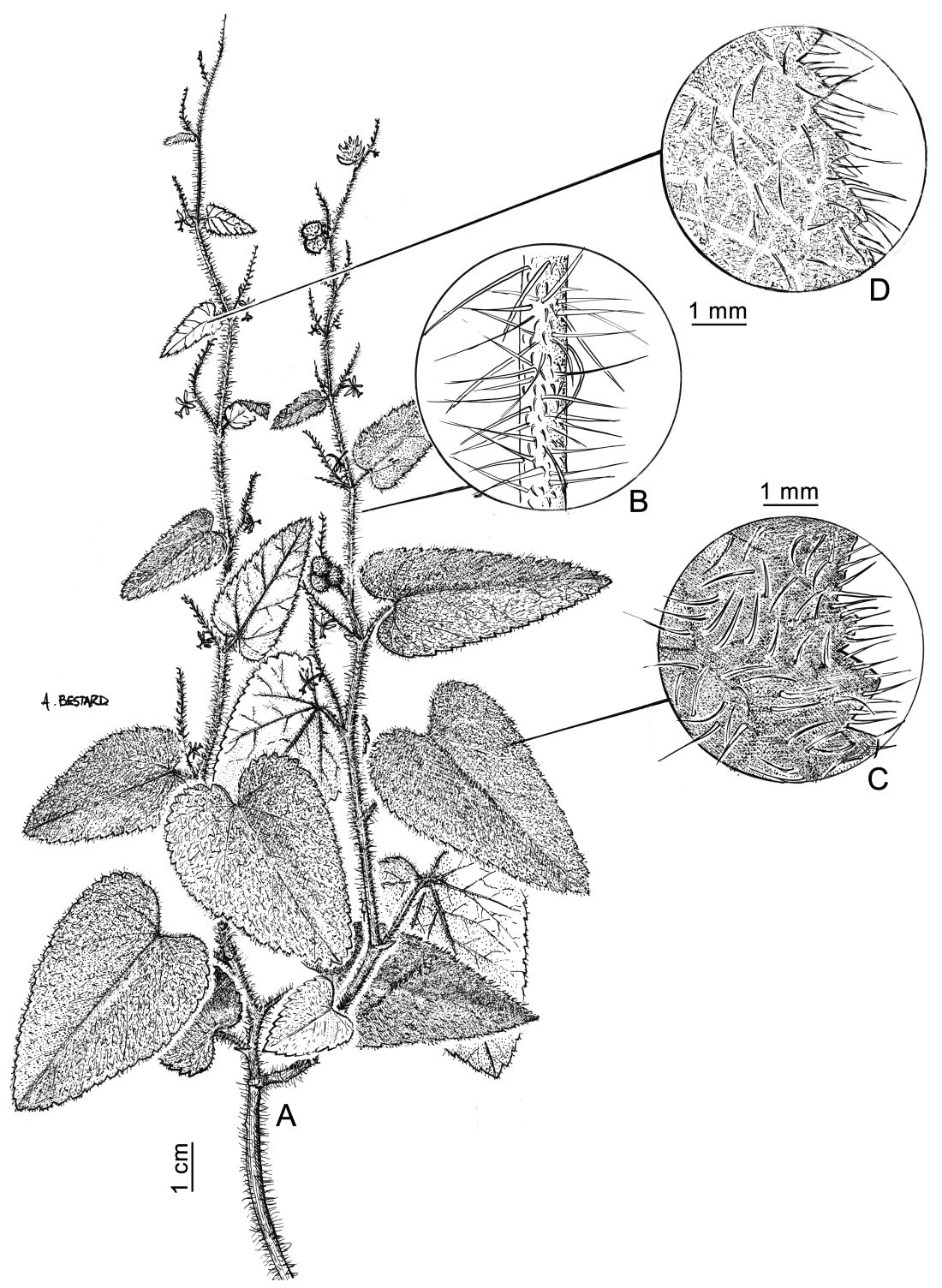 Sufrútice hasta de 1 m de alto, con rizoma generalmente vertical, de 2-10 mm de diámetro, de superficie rugosa; vástagos aéreos ramificados desde la base, con entrenudos de 2-10 cm de largo, erguidos con ápices decumbentes o volubles, híspido urticantes, con tricomas 1-celulares, largos, rígidos y patentes hasta de 4 mm de largo, tricomas 1-celulares cortos y curvos y urticantes. Hojas subsésiles o con pecíolo de 0,5-2 cm de largo; estípulas triangulares a lanceoladas, de (2,5-)3,5-6 × (0,6-)1-1,5(-2), agudas, largamente ciliadas; lámina de formas variadas, de (2,2-)4-6,6(-7,5) × 0,8-2(-3) cm, no reflexa, concolora a discolora, agudas a obtusas, redondeadas a cordadas, el margen serrulado o aserrado, rara vez dentado-acuminado, generalmente ciliado, cara adaxial con tricomas 1-celulares largos, urticantes, esparcidos y glandulares subsésiles, cara abaxial con tricomas 1-celulares y urticantes esparcidos, más abundantes sobre los nervios. Inflorescencias en botrioides de 3,5-9 mm de largo; raquis con tricomas simples patentes y glandulares sésiles; pedúnculos de 1 cm de largo; bráctea basal elíptica, de 1,5-3 mm de largo, generalmente entera, a veces con 1-2 pequeños dientes en la base; brácteas del eje principal elípticas o angostamente elípticas, de 1,5-2 mm de largo, agudas, cara abaxial de brácteas y sépalos con tricomas simples, ciliados. Flores estaminadas con epipodio de 0,5-2 mm de largo e hipopodio de 0,3-2 mm de largo; sépalos 3, obovados a elípticos, de 0,9-1,6 mm de largo, cuculados; estambres 3, filamentos cilíndricos ca. 0,5 mm de largo, anteras de contorno oblongo, de 0,3 mm de largo, rudimento del ovario subcónico a semiesférico. Flores pistiladas con pedicelo de 0,6-2 mm de largo; sépalos 6, elípticos o angostamente elípticos, de 2,5-3,5 mm de largo, obtusos, ciliados; ovario hirsuto; estilos de 2,4-5 mm de largo, soldados hasta la parte media, superficie estigmática con papilas cilíndricas enteras o divididas en el ápice. Fruto un elaterio subgloboso, de 8-9 mm de diámetro. Semillas esféricas, de 2-4 mm de diámetro, con papilas esféricas y convexas. Var. discolor.- Hojas discoloras; lámina triangular-ovada a anchamente ovada, base redondeada, a veces cordada, cara adaxial oscura con tricomas simples esparcidos o tricomas simples y escasos tricomas fasciculados; cara abaxial más clara hasta blanquecina con pubescencia densamente incana de tricomas simples y tricomas 2-4 fasciculados.
