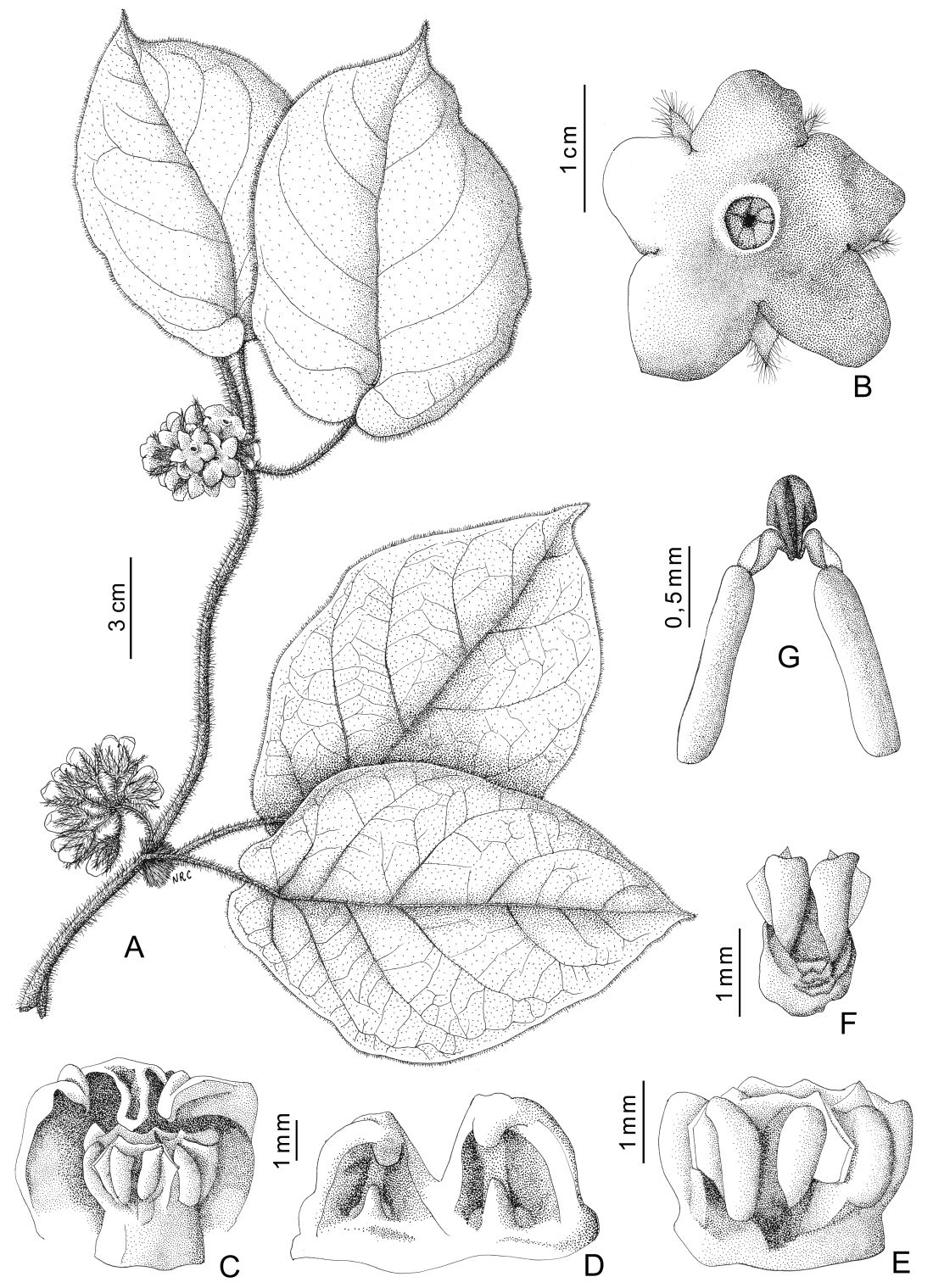 Volubles, tallos hasta de 13 m largo y hasta 4 mm de diámetro, no suberificados en la base; pubescencia hirsuta, mixta. Hojas moderadas a largamente pecioladas, lámina anchamente ovada, anchamente ovado-elíptica o suborbicular, de 12,5-30 × 8-22 cm, ápice agudo a cuspidado, base cordada, 6-7 pares de nervios secundarios; pubescencia mixta más densa en la cara abaxial, cara adaxial con 6-9 coléteres. Inflorescencias subglobosas, con 5-19 flores, pedúnculo de 10-18 mm de largo, brácteas lineares, de 12-13 mm de largo, pubescentes. Flores con pedicelo de 10-15 mm de largo, hirsuto; lóbulos del cáliz membranáceos, ovado-lanceolados u oblongo-elípticos, de 7-18 × 3,1-7 mm, densa y diminutamente glandular-pubérulos, e hirsutos, acuminados, sin coléteres en las axilas; corola urceolada, tubo de 4-6,5 mm de largo, lóbulos anchamente ovados a suborbiculares, de 4,5-7 × 5-8 mm, cara adaxial castaño clara, castaña a anaranjada, densamente erecto-pubérulo-papilosos, con tricomas cónicos y gruesos; segmentos de la corona carnosos, con el tercio apical engrosado, lateralmente cóncavos e incurvos hacia el ginostegio; ginostegio de 2 mm de largo, con cabeza estilar convexa, anteras con alas muy cortas, truncas; retináculo subelíptico o angostamente obovoide, de 0,45-0,5 mm de largo, polinios de contorno oblongo, de 1,2-1,3 mm de largo, teretes, con un delgado margen hialino. Folículos simples, de 14-16 × 5,5-7 cm, 7-costado-alados, a veces con dos alas laterales reducidas a crestas cortas, la superficie hirsuta. Semillas 470-530 por folículo, obovadas, de 0,5-0,9 × 0,25-0,6 cm, superficie verrucosa, ápice dentado.