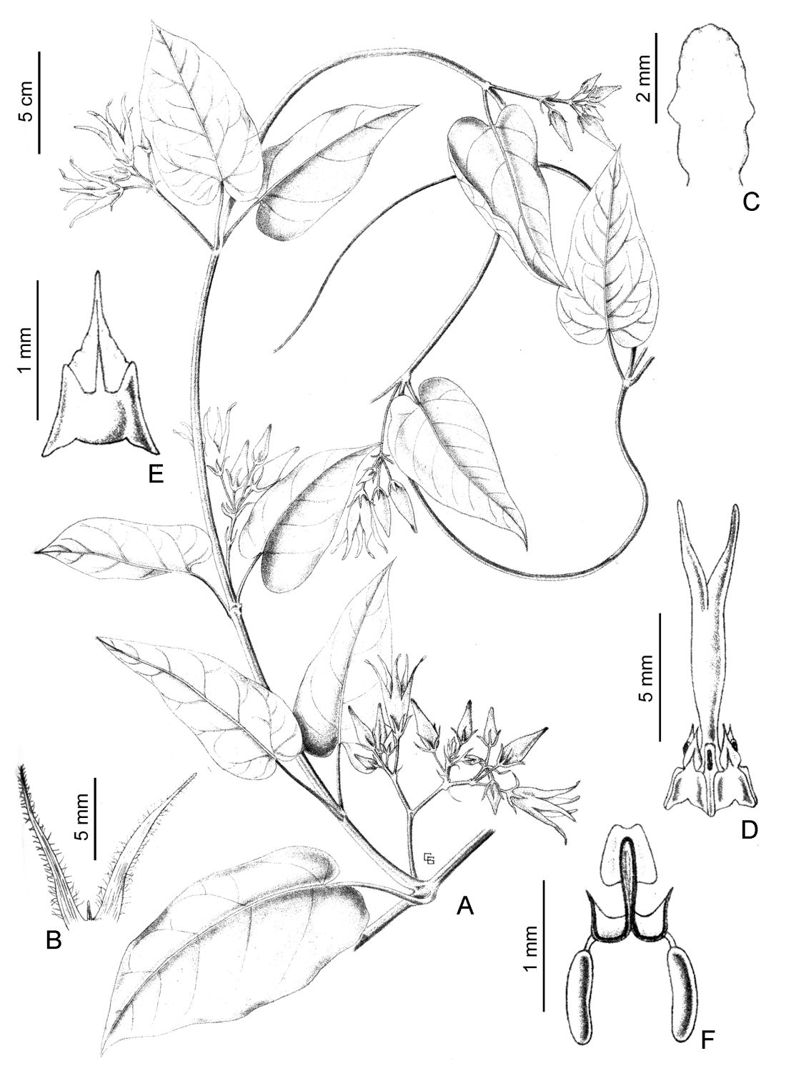 A. Rama florífera. B. Lóbulos del cáliz y coléter. C. Lóbulo de la corona. D. Ginostegio. E. Antera. F. Polinario. Tomado de Gen. Sp. Pl. Argent. 2: lámina 26. 1944.