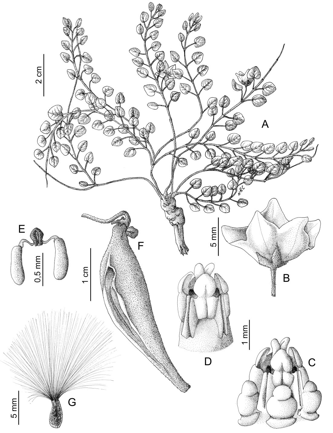 A. Planta. B. Flor. C. Corona y ginostegio. D. Ginostegio. E. Polinario. F. Fruto. G. Semilla.