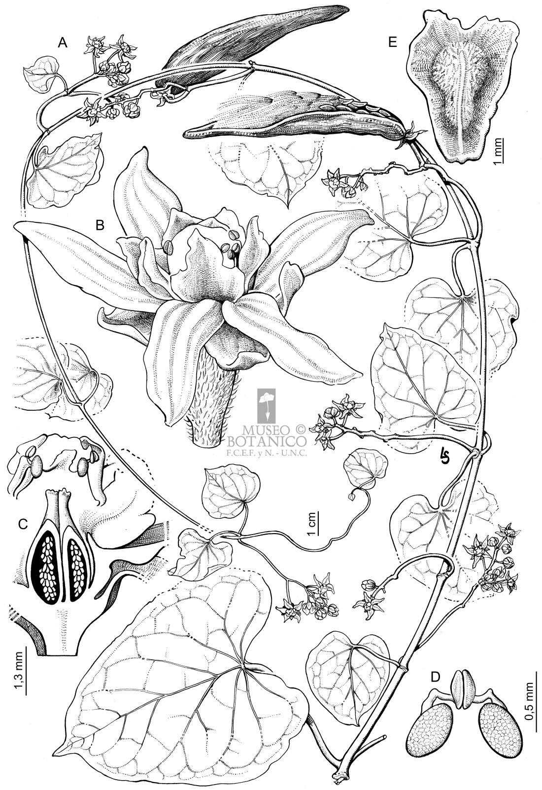 Voluble, rizoma alargado, cilíndrico, de mayor diámetro que ramas; raíces tuberosas ausentes; ramas puberulentas a glabrescentes. Hojas con pecíolo de (1,5-)2,5-2,7 cm de largo; lámina ovada, de 7,5 × 4 cm; base cordada a lobada, ápice agudo, superficie esparsamente pubescente en ambas caras, con 8 coléteres en la base adaxial de la vena media. Inflorescencia corimbiforme, subaxilar, con 8-15 flores; pedúnculo de 2-2,5 cm de largo. Flores con pedicelo de 0,7-1,2 cm de largo; cáliz glabrescente, margen y base de la superficie abaxial pubescentes, coléteres bajo el seno adaxial, lóbulos subovados, de 1,7-5 × 0,8-2 mm; corola subrotácea de 10-17 mm de diámetro, tubo de 1 mm de largo, superficie externa glabra, crema o amarillenta, superficie interna crema, amarillenta o vinácea, garganta puberulenta; lóbulos ovados, 6,4-6,7 × 2,5-3 mm, margen revoluto; corona con lóbulos opuestos a las anteras, levemente unidos en la base, 3-fidos, con dos segmentos laterales anchos y uno central alargado, erecto o incurvo, blancos, rojizos o violáceos; ginostegio sésil o subsésil; membrana apical de las anteras suborbicular; cabeza estilar convexa; retináculo cónico a elipsoide, de 0,3 mm de largo; caudículas subhorizontales, de 0,1 mm de largo, insertas en la parte media del retináculo; polinios largamente oblongos, de 0,45 mm de largo. Folículos obclaviformes, deltoides en sección transversal, de 10 × 2,5 × 1 cm, extremo aguzado, placenta con costillas aserradas. Semillas 250-270, obovadas, de 5-8 × 3-4 mm, castaño-oscuras, rugosas y tuberculadas en ambas caras; con margen ancho, ápice groseramente dentado.