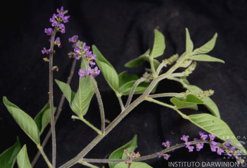 Subarbustos de hasta 2,5 m de alt. Ramas jóvenes densa- a espaciadamente hirsutas, a glabras con el tiempo. Hojas trifoliadas con pecíolo de 2-7,5 cm, peciólulos de 3-4 mm, velludos; folíolos de 4-9,3 × 2,2-4,7 cm, anchamente ovados a ovado-lanceolados, caudado-acuminados, la cara abaxial de color más claro, pubescentes (principalmente sobre las nervaduras), a glabrescentes. Inflorescencia con 1- 3 flores por nudo, pedúnculo de 4-14 cm. Flores de 4-5,5 mm; cáliz con glándulas, adpreso-pubescente; corola azul a violeta, estandarte biauriculado. Frutos de 6-7 × 4-5 mm, apiculados, castaño oscuros, con nervaduras en resalto, adpreso-pubescentes, eglandulares. Semillas de 4-5 × 2 mm, generalmente veteadas.