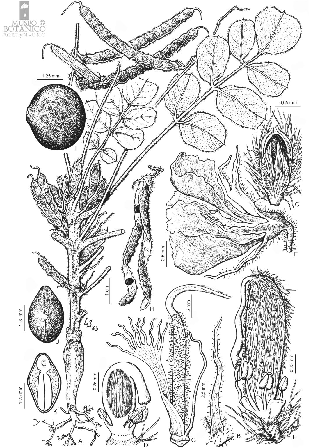 A. Hábito. B. Estípula. C. Flor cleistógama. D. Androceo y gineceo de uno de los tipos de flor cleistógama (corola nula, gineceo glabro. E. Otro tipo de flor cleistógama donde se ha eliminado el cáliz. F. Flor casmógama. G. Androceo y gineceo de flor casmógama. H. Fruto de flor casmógma dehiscente. I-K. Semilla del fruto representado en H, vista lateral, hilar y corte longitudinal respect.