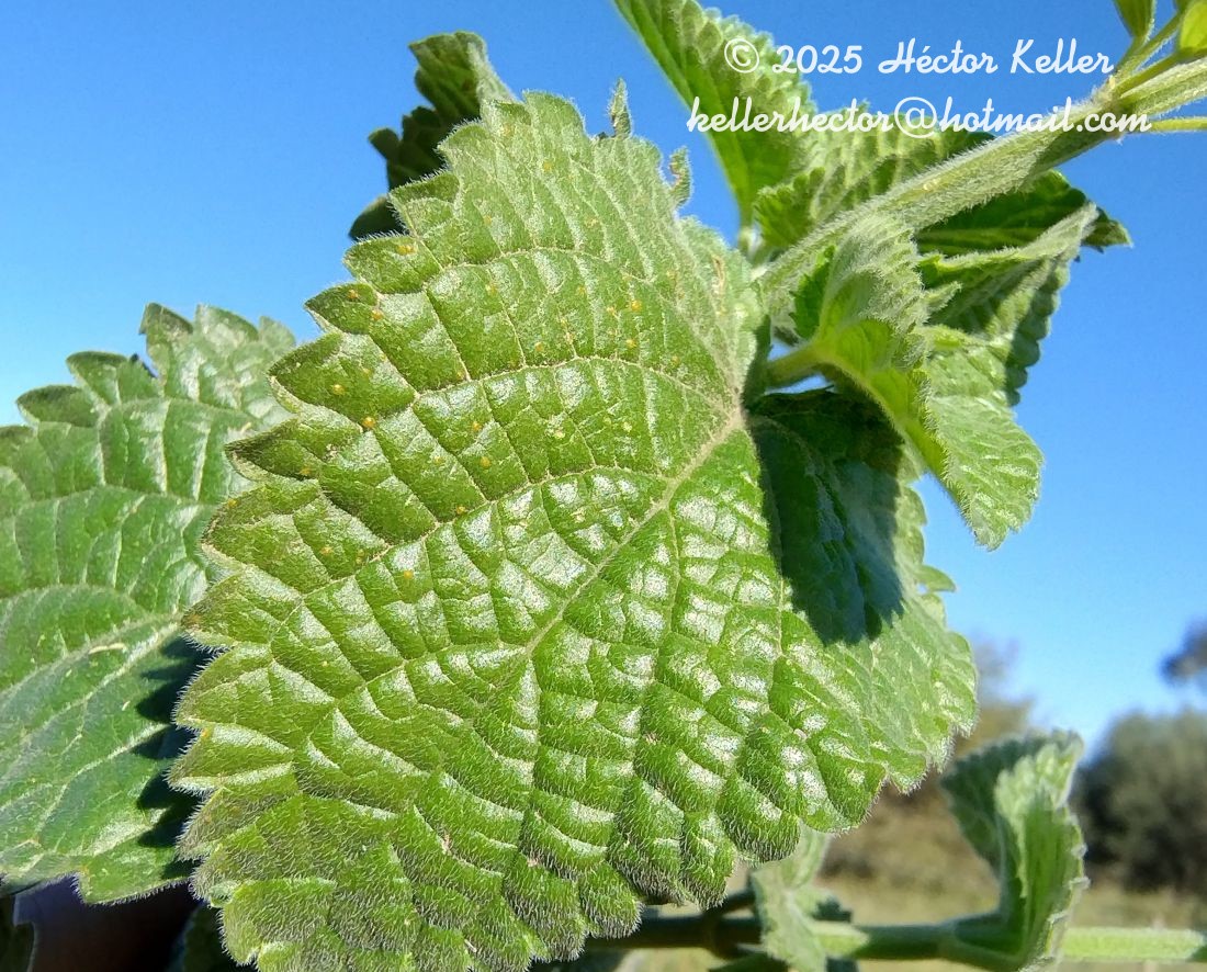 Sufrútices erectos, hasta de 80 cm de alto, con pubescencia glandular abundante o no. Hojas con pecíolos de 0,2-1,5 cm de largo; láminas ovado-triangulares, de 1-4,5 × 1-3,5 cm, base cordada, ápice agudo, margen aserrado, pubescente, más densamente en la cara abaxial, con escasos a densos pelos glandulares, a veces con aspecto incano. Verticilastros de 4-6 flores, reunidos en pseudoracimos terminales laxos, de 10-20 cm de largo. Brácteas florales persistentes en antesis, ovadas, de 4-7 mm de largo, pubescentes, no amplexicaules, de color verde. Flores con pedicelo de 2-5 mm de largo. Cáliz de 7-8 mm de largo, 5-nervado, labio superior de ápice entero, labio inferior de ápice 2-dentado, pubescencia variable, con pelos glandulares en la cara externa, la cara interna pubescente en la mitad superior. Corola celeste claro a lila, con mácula blanca o blanquecina, de 12-15 mm de largo, tubo de 7-8 mm de largo, pubescente en la mitad superior externa, labio superior de 3-5 mm de largo, cóncavo, entero o emarginado, labio inferior de 5-9 mm, trilobado, el medio mayor y emarginado. Estambres inclusos. Estilo exerto hasta de 10 mm de largo. Clusas elipsoides, de 2- 3 mm de largo, trígonas, pardas, lisas o finamente granulosas.