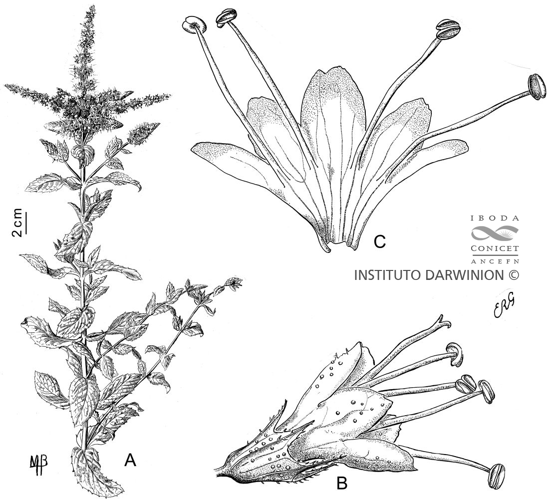 Hierbas anuales o perennes de vida corta, de 0,2-1 m de alto; tallos subglabros a esparcidamente pilosos en la base, más densamente distalmente, con pelos antrorsos, patentes o adpresos, largos, y con glándulas sésiles esparcidas. Hojas sésiles a subsésiles; láminas elípticas a ovadas, de 1-6,5(-9) × 0,3-3(-5) cm, base angostamente atenuada, decurrente sobre el pecíolo, ápice agudo, margen irregularmente serrado-dentado, subglabras, estrigosos únicamente sobre las nervaduras o, en ocasiones, con algunos pelos laxos, multiseriados o no, en el resto de la superficie, con frecuencia con glándulas sésiles inconspicuas. Capítulos globosos, de 0,6-1,5 cm de diámetro, multifloros, solitarios en la axila de las hojas superiores; pedúnculos de 0,3-1,5 cm de largo, pilosos, con pelos antrorsos, adpresos; bractéolas involucrales angostamente elípticas, de 5- 8 mm de largo, inicialmente patentes, luego reflexas, externamente subglabras o con pelos cortos, dispersos, restringidos cerca del ápice, internamente pilosas, con pelos patentes, largos, laxos o densos, mezclados con glándulas sésiles, los márgenes ciliados. Flores subsésiles, con pelos rectos, largos en la base, naciendo del receptáculo; cáliz florífero 3-4 mm de largo acrescente hasta 6 mm en el fruto, externamente glabro, excepto por la presencia de algunos pelos antrorsos, dispersos, entremezclados con glándulas sésiles en la mitad inferior del tubo, internamente más o menos glabro, margen ciliado, dientes del cáliz de 2-2,5 mm de largo, largamente aristados; corola de 2,5-6 mm de largo, blanca con manchas rosado-claras en el labio superior. Clusas angostamente oblongo-obovoides, de 0,7-0,8 mm de largo, de color pardo oscuro, glabras, con frecuencia mucilaginosas cuando húmedas.
