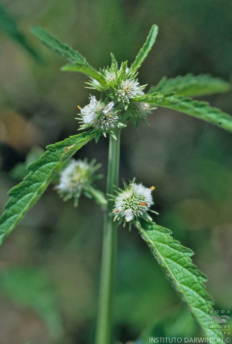 Hierbas anuales o perennes de vida corta, de 0,2-1 m de alto; tallos subglabros a esparcidamente pilosos en la base, más densamente distalmente, con pelos antrorsos, patentes o adpresos, largos, y con glándulas sésiles esparcidas. Hojas sésiles a subsésiles; láminas elípticas a ovadas, de 1-6,5(-9) × 0,3-3(-5) cm, base angostamente atenuada, decurrente sobre el pecíolo, ápice agudo, margen irregularmente serrado-dentado, subglabras, estrigosos únicamente sobre las nervaduras o, en ocasiones, con algunos pelos laxos, multiseriados o no, en el resto de la superficie, con frecuencia con glándulas sésiles inconspicuas. Capítulos globosos, de 0,6-1,5 cm de diámetro, multifloros, solitarios en la axila de las hojas superiores; pedúnculos de 0,3-1,5 cm de largo, pilosos, con pelos antrorsos, adpresos; bractéolas involucrales angostamente elípticas, de 5- 8 mm de largo, inicialmente patentes, luego reflexas, externamente subglabras o con pelos cortos, dispersos, restringidos cerca del ápice, internamente pilosas, con pelos patentes, largos, laxos o densos, mezclados con glándulas sésiles, los márgenes ciliados. Flores subsésiles, con pelos rectos, largos en la base, naciendo del receptáculo; cáliz florífero 3-4 mm de largo acrescente hasta 6 mm en el fruto, externamente glabro, excepto por la presencia de algunos pelos antrorsos, dispersos, entremezclados con glándulas sésiles en la mitad inferior del tubo, internamente más o menos glabro, margen ciliado, dientes del cáliz de 2-2,5 mm de largo, largamente aristados; corola de 2,5-6 mm de largo, blanca con manchas rosado-claras en el labio superior. Clusas angostamente oblongo-obovoides, de 0,7-0,8 mm de largo, de color pardo oscuro, glabras, con frecuencia mucilaginosas cuando húmedas.
