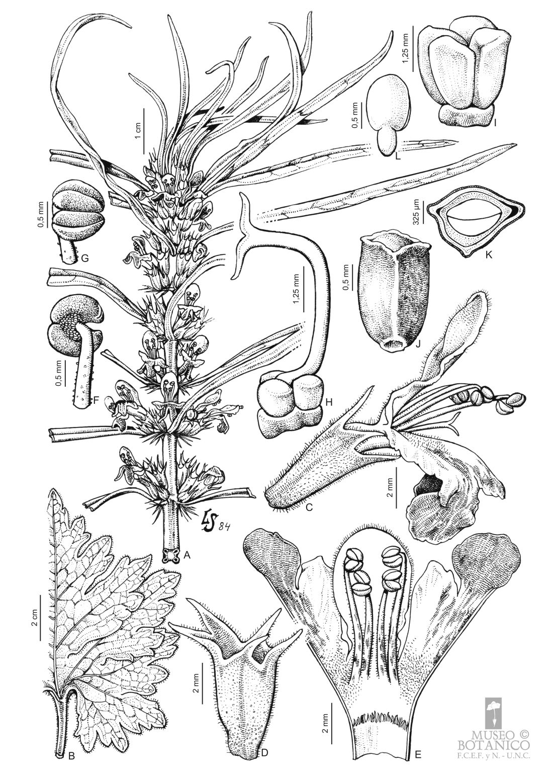 A. Rama florífera. B. Hoja basal C. Flor, vista lateral. D. Cáliz. E. Corola desplegada (abierta por el centro del labio inferior), los estambres se apoyan sobre el labio superior formado por 2 pétalos y un anillo de pelos en la zona media del tubo corolino. F-G. Estambre de botón floral. H. Gineceo estilobásico. I. Fruto, vista lateral. J. Clusa, vista adaxial. K. Transcorte por clusa. L. Embrión .(