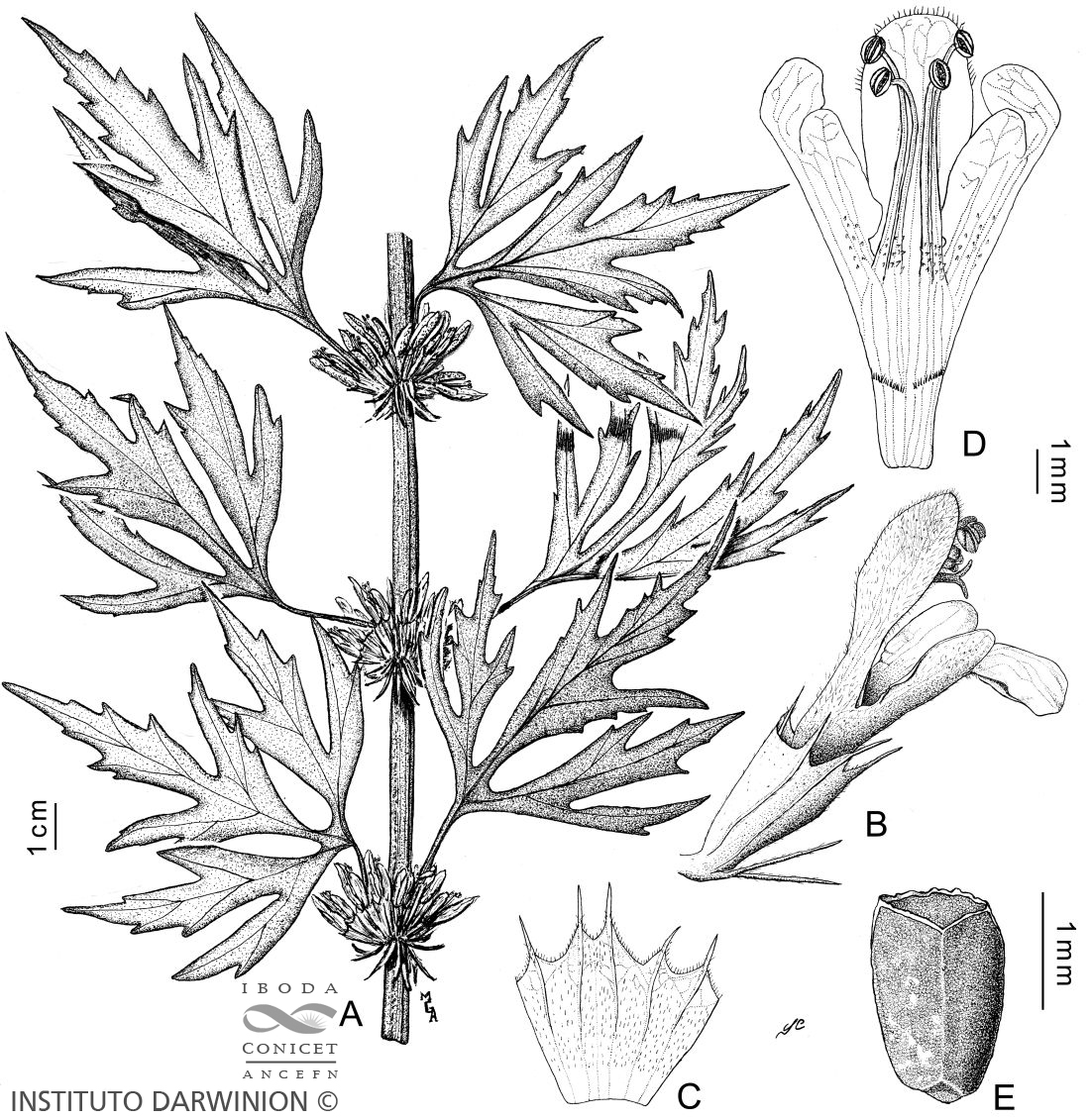 Hierbas hasta de 2 m de alto; tallos glabros o pubérulos, simples o ramosos. Hojas pecioladas, con pecíolos de 1-5 cm de largo, láminas 3-5-palmatisectas, de 2-10 × 3-7 cm, segmentos irregularmente divididos, pubescencia densa en el envés. Flores sésiles dispuestas en verticilastros plurifloros distantes entre sí 1,5-7 cm; cáliz infundibuliforme, de 7-9 mm de largo, dientes subiguales, ca. 1,5 mm de largo; corola de 8-13 mm de largo, lila o morada, ligeramente pubescente en la mitad superior del tubo y en los labios, labio superior cóncavo, de 5-7 mm de largo, labio inferior de 6-7 mm de largo, lóbulo medio 2-lobulado, mayor que los laterales; filamentos estaminales pilosos en la base; estilo glabro; ramas estigmáticas subiguales. Clusas ca. 2 mm de largo.