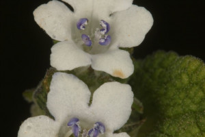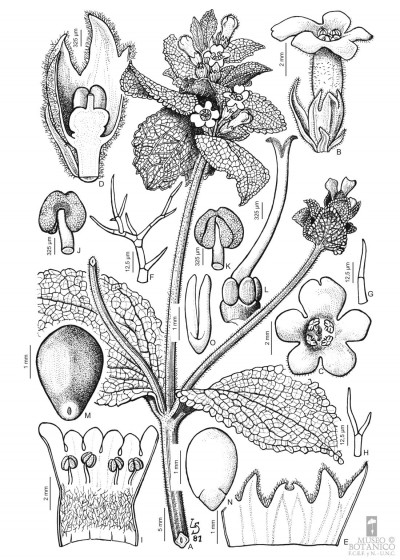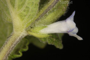Subarbustos aromáticos, con rizoma leñoso procumbente; tallos ascendentes a decumbentes, poco ramificados, densamente pubescente, con pelos cortos y ramificados. Hojas con pecíolos lanuginosos, de 5-15 mm de largo; láminas ovado-oblongas, de 2-6 × 1-4 cm, base redondeada a cuneada, ápice obtuso a subagudo, margen crenado, cara abaxial densamente pubescente, con pelos ramificados. Flores en glomérulos densos axilares o terminales; brácteas foliáceas; cáliz ca. 1,5 mm de largo, acrescente a la madurez hasta 10 mm, dientes triangulares, los 3 superiores soldados, los 2 inferiores soldados hasta la mitad, pubescencia de pelos ramificados; corola blanca o azul, tubo de 3,5-4,5 mm de largo; estambres insertados por encima del tubo de la corola, inclusos. Clusas obovoides, de 2 mm de largo, negras.