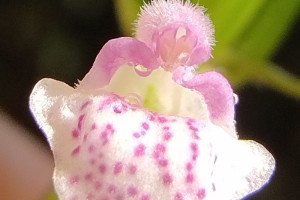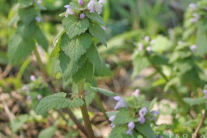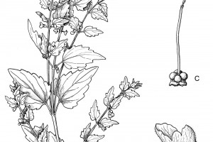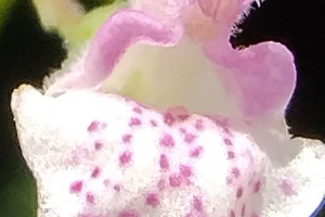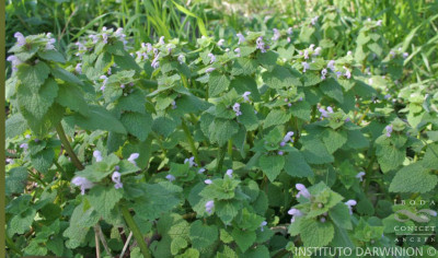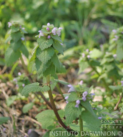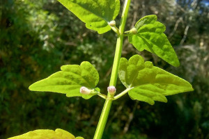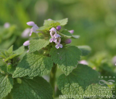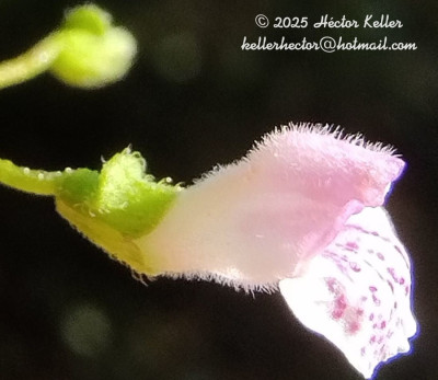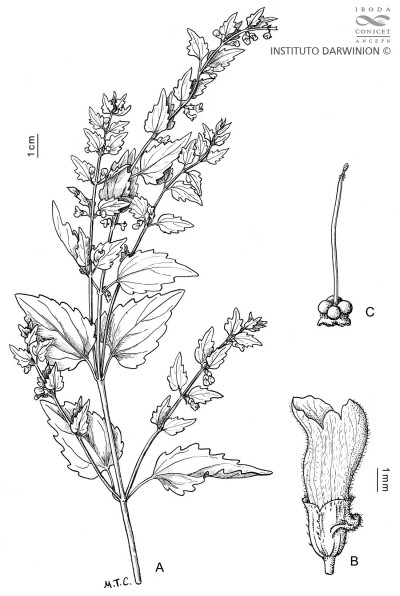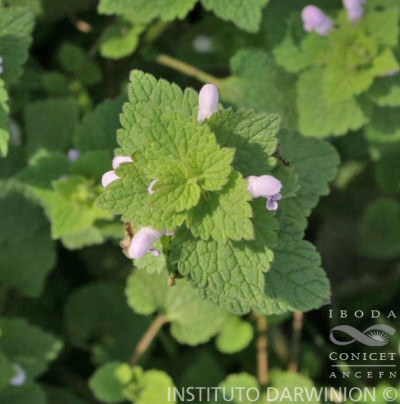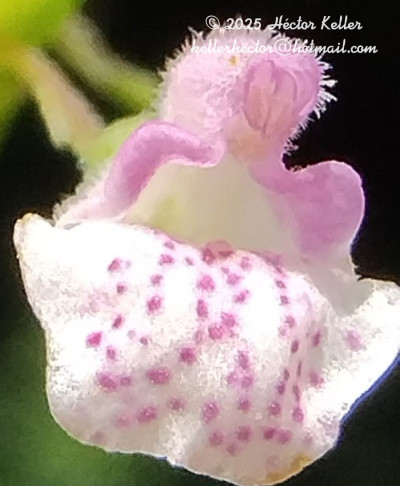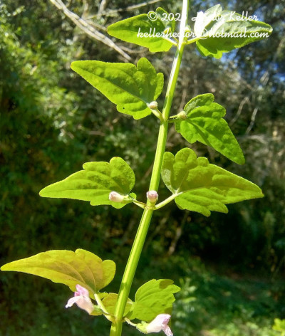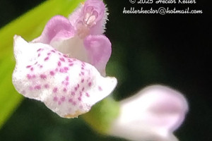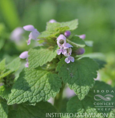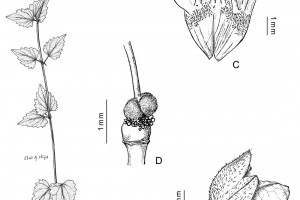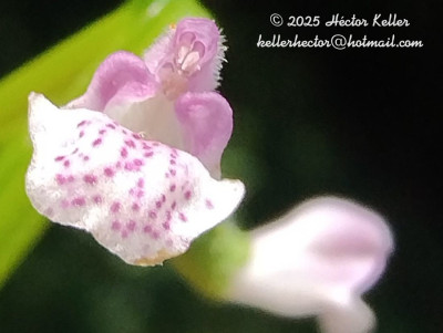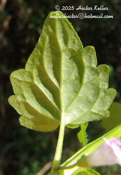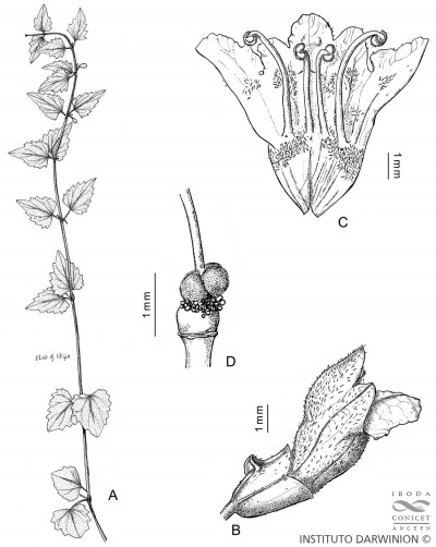 Hierbas perennes, de 40-50 cm de alto; tallos radicantes en los nudos inferiores, glabros o pubérulos. Hojas con pecíolo de 0,2-2 cm de largo; láminas ovadas a subtriangulares, de 1-3,5 × 1-3 cm, ápice agudo a obtuso y base truncada o subcordada, margen irregularmente dentado-serrado, ambas caras glabras o con escasos pelos estrigosos. Flores solitarias en la axila de las hojas, reunidas en pseudoracimos foliosos; pedicelos de 3-5 mm de largo; bractéolas pequeñas. Brácteas indistinguibles de las hojas. Cáliz de 2-3 mm de largo, subglabro, con pubescencia breve. Corola rosada, de 5-7 mm de largo, pubérula, tubo de 8-10 mm de largo, labio superior entero, el inferior 3-lobado, con lóbulos laterales soldados al superior. Estambres pilosos en la base. Ginóforo uniforme, con glándulas. Clusas globosas, ocráceas, tuberculadas.
