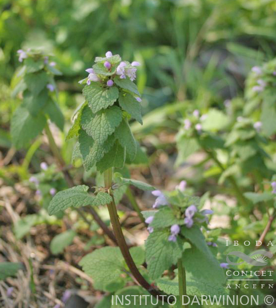 Hierbas perennes, de 40-50 cm de alto; tallos radicantes en los nudos inferiores, glabros o pubérulos. Hojas con pecíolo de 0,2-2 cm de largo; láminas ovadas a subtriangulares, de 1-3,5 × 1-3 cm, ápice agudo a obtuso y base truncada o subcordada, margen irregularmente dentado-serrado, ambas caras glabras o con escasos pelos estrigosos. Flores solitarias en la axila de las hojas, reunidas en pseudoracimos foliosos; pedicelos de 3-5 mm de largo; bractéolas pequeñas. Brácteas indistinguibles de las hojas. Cáliz de 2-3 mm de largo, subglabro, con pubescencia breve. Corola rosada, de 5-7 mm de largo, pubérula, tubo de 8-10 mm de largo, labio superior entero, el inferior 3-lobado, con lóbulos laterales soldados al superior. Estambres pilosos en la base. Ginóforo uniforme, con glándulas. Clusas globosas, ocráceas, tuberculadas.