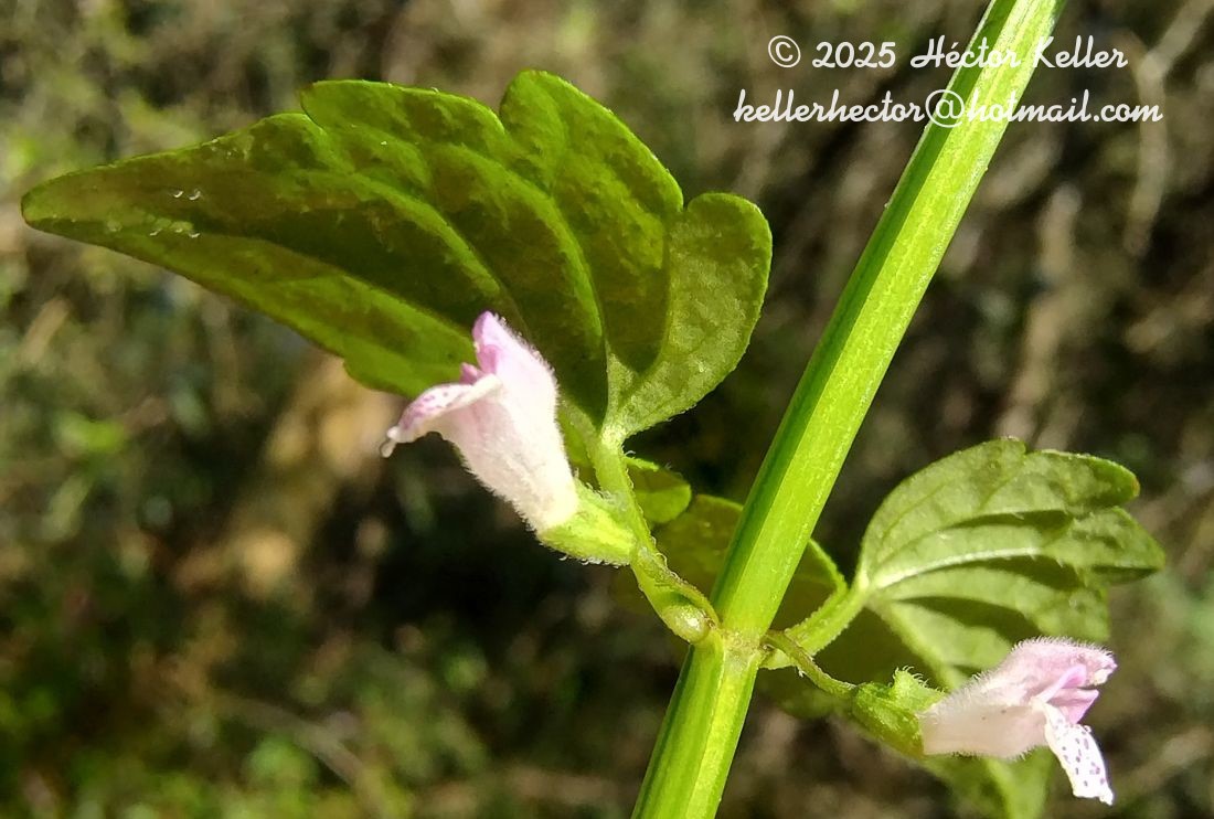 Hierbas perennes, de 40-50 cm de alto; tallos radicantes en los nudos inferiores, glabros o pubérulos. Hojas con pecíolo de 0,2-2 cm de largo; láminas ovadas a subtriangulares, de 1-3,5 × 1-3 cm, ápice agudo a obtuso y base truncada o subcordada, margen irregularmente dentado-serrado, ambas caras glabras o con escasos pelos estrigosos. Flores solitarias en la axila de las hojas, reunidas en pseudoracimos foliosos; pedicelos de 3-5 mm de largo; bractéolas pequeñas. Brácteas indistinguibles de las hojas. Cáliz de 2-3 mm de largo, subglabro, con pubescencia breve. Corola rosada, de 5-7 mm de largo, pubérula, tubo de 8-10 mm de largo, labio superior entero, el inferior 3-lobado, con lóbulos laterales soldados al superior. Estambres pilosos en la base. Ginóforo uniforme, con glándulas. Clusas globosas, ocráceas, tuberculadas.