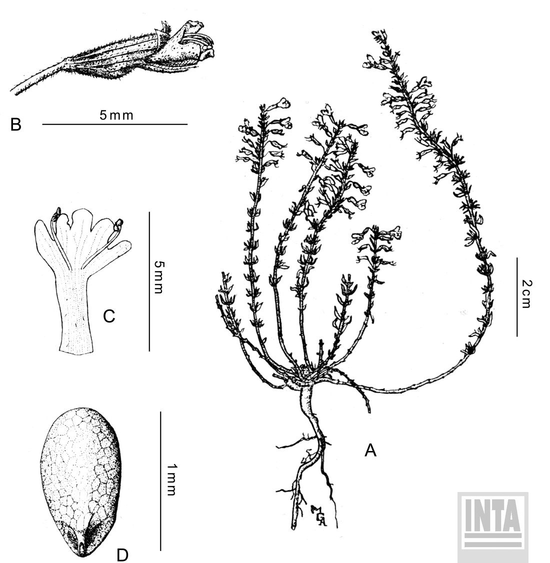 Hierbas perennes hasta de 20 cm de alto; tallos algo decumbentes y luego erectos, con pubescencia retrorsa, principalmente en partes jóvenes. Hojas sésiles, láminas linear- elípticas, de 4-10 × 0,8-2,5 mm, base cuneada, ápice agudo, margen entero, punteado-glandulosas, con pubescencia estrigosa. Flores pediceladas, pedicelos de 2-6 mm de largo, agrupadas en verticilastros axilares, 3-6-floros; bractéolas 2, foliáceas. Cáliz de 4-5 mm de largo, bilabiado, giboso, pubérulo, labio superior con 3 dientes anchamente triangulares, erectos o apenas reflejos, el labio inferior con 2 dientes más largos, subulados. Corola blanca o lila, de 4-7(-8) mm de largo, labio superior emarginado, inferior 3-lobado con lóbulo central mayor que los laterales. Estambres inferiores 2, filamentos de 3 mm de largo, glabros, superiores ausentes. Estilo de 5,5 mm de largo, 2-fido. Clusas obovoides, de 1 mm de largo, castañas, superficie reticulada.