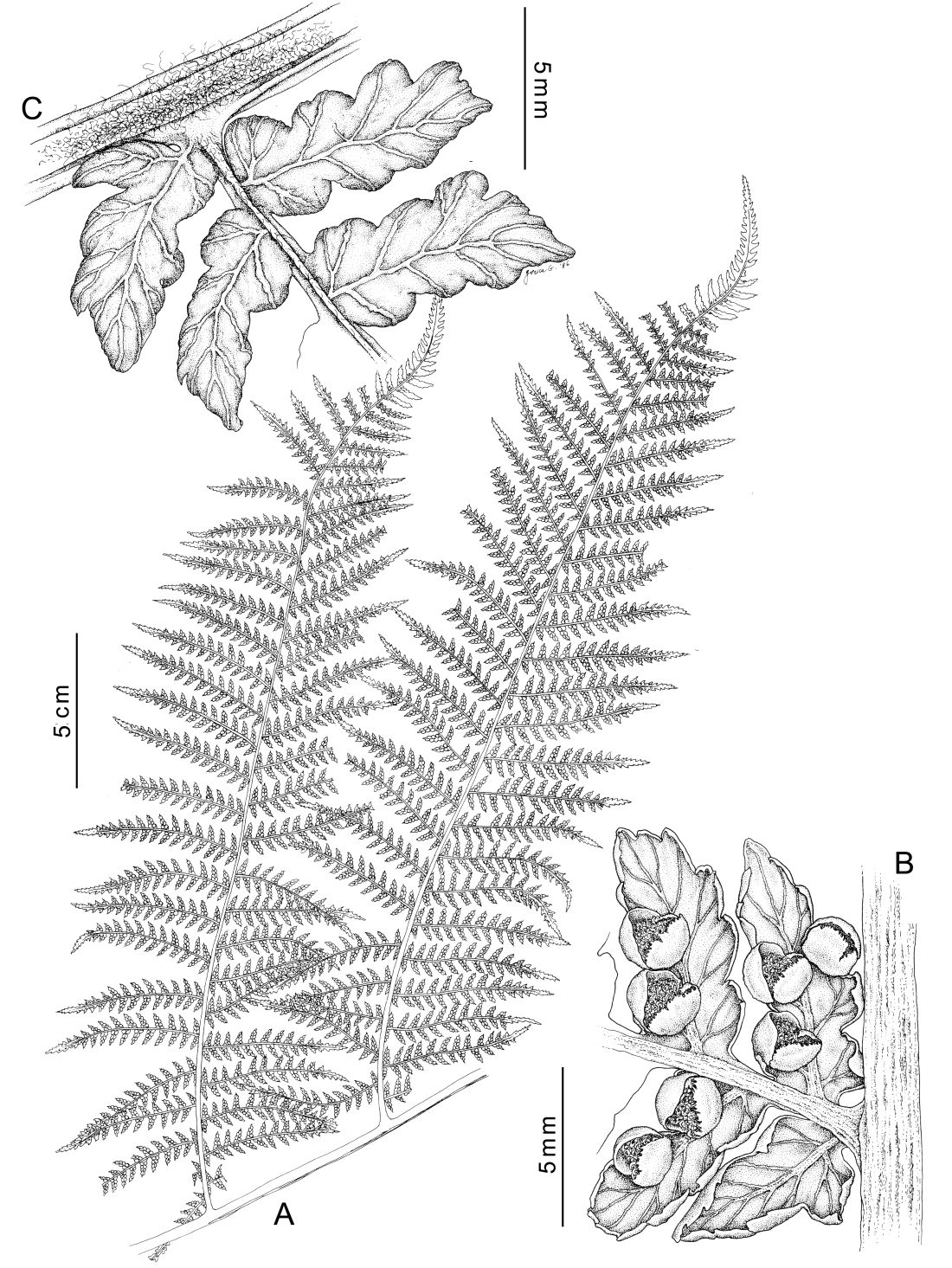 A. Porción de una fronde (2 pinnas). B. Detalle de segmentos fértiles, cara abaxial, mostrando la venación, soros e indusios. C. Detalle del raquis secundario, cara abaxial, y segmentos estértiles.