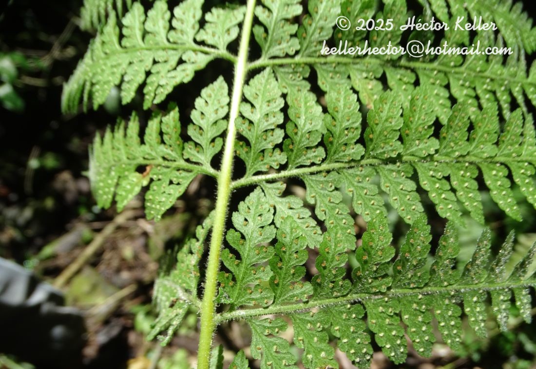 Rizomas de 0,5-1 cm de diámetro, no ramificados, comúnmente subterráneos, pubescentes con tricomas de 1 mm de largo, ciliados, castaño-claros. Frondes elíptico-lanceoladas; pecíolos de 0,6-1,2 m de largo, castaño oscuros proximalmente, pajizos distalmente, con yemas peciolares que originan raíces en la base, sulcados en cara adaxial; surco pubescente con dos tipos de pelos: los primeros catenados, castaños, los segundos 1-celulares, aciculares, hialinos; láminas de 1-1,8 m de largo, 2-pinnado-pinnatífidas a 3-pinnadopinnatífidas, erectas a arqueadas; raquis castaño-amarillentos, sulcados, densamente pubescentes con pelos como los del pecíolo: en cara adaxial con dos tipos de pelos, los tricomas catenados más abundantes; en cara abaxial únicamente pelos hialinos, aciculares, a menudo curvados; pinnas 15-30 pares, alternas, pecioladas, lanceoladas a lineares, de 2-60 × 0,9-40 cm; raquis secundarios adaxialmente sulcados, mismo indumento que el raquis secundario; pínnulas pecioladas, linear-lanceoladas, de 3- 22 × 1,2-9 cm; pinnas basales no reducidas o escasamente reducidas; cóstulas abaxialmente pubescentes, sin alas herbáceas perpendiculares en cara adaxial o, si presentes, las alas del lado basiscópico no decurrentes en el eje del siguiente orden de división; segmentos oblongo-lanceolados, pinnatisectos en pinnulas basales, con tricomas hialinos, aciculares, rectos en la cara abaxial; venas pubescentes con tricomas catenados; ápice de venas estériles en cara adaxial delgado. Soros redondeados, marginales, naciendo principalmente en los senos, de 0,6-1 mm de diámetro; indusios glabros. Esporas triletes, tetraédricas, de 19-27 × 23-25 µm, plano-hemisféricas en vista ecuatorial, castaño-oscuras, con verrugas uniformes, redondeadas, ornamentadas con cordones.