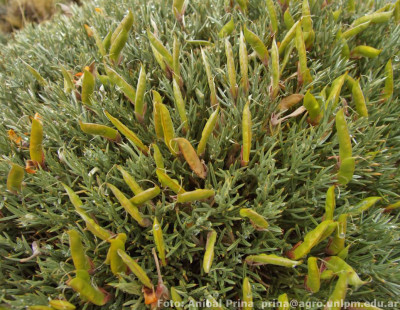 Arbusto muy decorativo, de 50-80 cm alt., ramoso hacia el ápice, densamente hojo¬so, estrigoso, con entrenudos de 5-10 (3-15) mm. Hojas viejas algo recurvas, de 15-25 (30) mm; folíolos de 10-20 (25) x ± 1 mm, con mucrones hasta 3 mm; pecíolos de 4-6 mm; estípulas de 3-6 (10) x 1-2 (3) mm, triangulares o lanceoladas en la misma rama, unidas entre sí 2 mm y por la base al pecíolo. Flores de 15-18 mm,'solitarias, anaran¬jadas, terminales o laterales, con pedúnculos de 8-13 (15) mm. Cáliz de 10-12 mm, es-trigoso, bilabiado, lóbulo superior 2-dentado, el inferior 3-dentado sobrepasándolo, tu¬bo de 3-4 mm. Vexilo de 12-15 x 2 mm, más ancho en la mitad inferior, plegado, ± re¬curvo, emarginado, bilobulado, pubescente a lo largo de la parte media del dorso, uña de 1,5 mm; alas de 15-16,5 mm, más angostas hacia el ápice, lampiñas o con algunos pe¬los, sin aurículas, uñas de 2-3 mm; quilla de 15-16 x 4-5 mm, glabra, uña de 3-4 mm. An-droceo de 16-18 mm. Gineceo de 14 mm, ovario de 7-9 x ca. 2 mm, 9-ovulado, pubes¬cente, estilo filiforme, estigma capitado. Legumbre de ± 30 x 5-7 mm, linear-lanceolada, subglabra, con 6-8 semillas de 4 x 3 mm, de color almendra, jaspeadas.