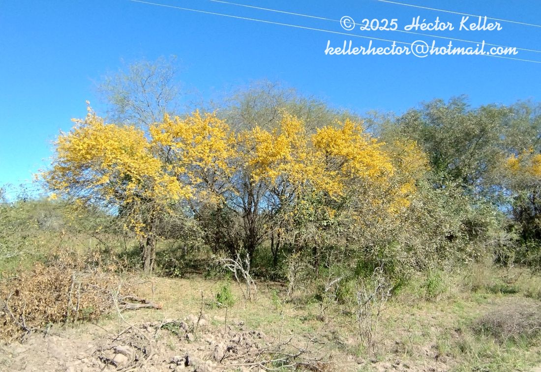 Arbol o arbusto de 1,5-4 (10) m alt. Raíces gemíferas. Corteza exfoliada en placas y franjas longitudinales. Espinas de 0,5-2 cm, subglabras a pubescentes; braquiblastos se-ríceos, globosos. Hojas de 1-7 cm, impari o paripinnadas, (1-) 2-4-(6-) yugadas, general¬mente fasciculadas; folíolos 3-13, 5-15 x 3-8 mm, elípticos a obovados, cuando imparipi-nnadas el terminal mayor, opuestos a subopuestos o alternos, glabros a brevemente seríceos, a veces glandulosos, pinnatinervios, margen entero o con glándulas excavadas. Raci¬mos de 0,5-8 era, fasciculados, seudocorimbiformes, 2-5-floros, Flores de 0,8-1 cm, ama¬rillas, rubrolineares. Cáliz de ± 3 mm, campanulado. Vexilo reniforme. Estambres con filamentos brevemente soldados en la base o hasta la mitad. Ovario obovoide a ovoi¬de, sésil. Drupa de 1,5-3,5 x 1,5-2,4 cm, ovoide, a levemente comprimida, glabra, lisa, ro¬jiza. Semillas 1 (2), de 1,2-1,8 cm, fusiforme-navicular, trasversalmente sulcadas, tegu¬mento tenue, rojizo.