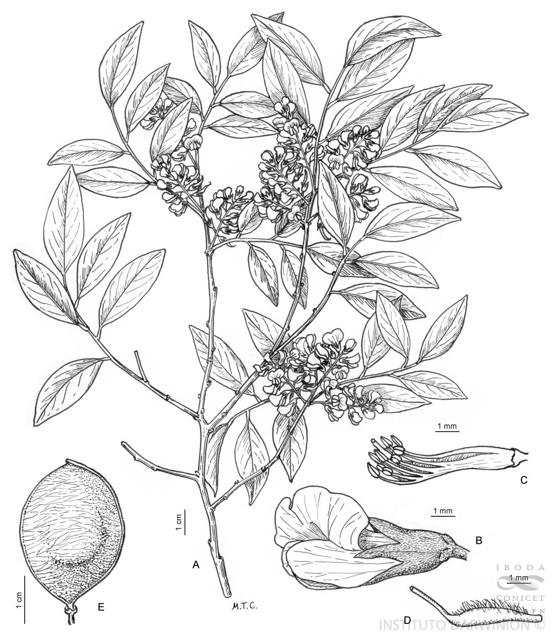 A. Rama florífera. B. Flor. C. Androceo y gineceo. D. Gineceo. E. Fruto.