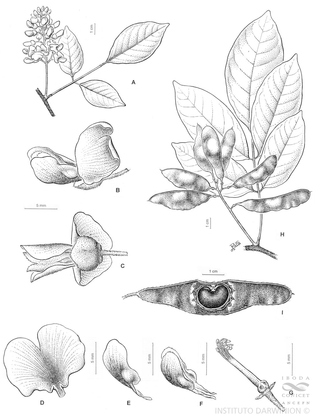 A. Rama florífera. B y C. Flor. D. Estandarte. E. Ala. F. Quilla. G. Androceo y gineceo. H. Rama con frutos. I. Fruto con semilla