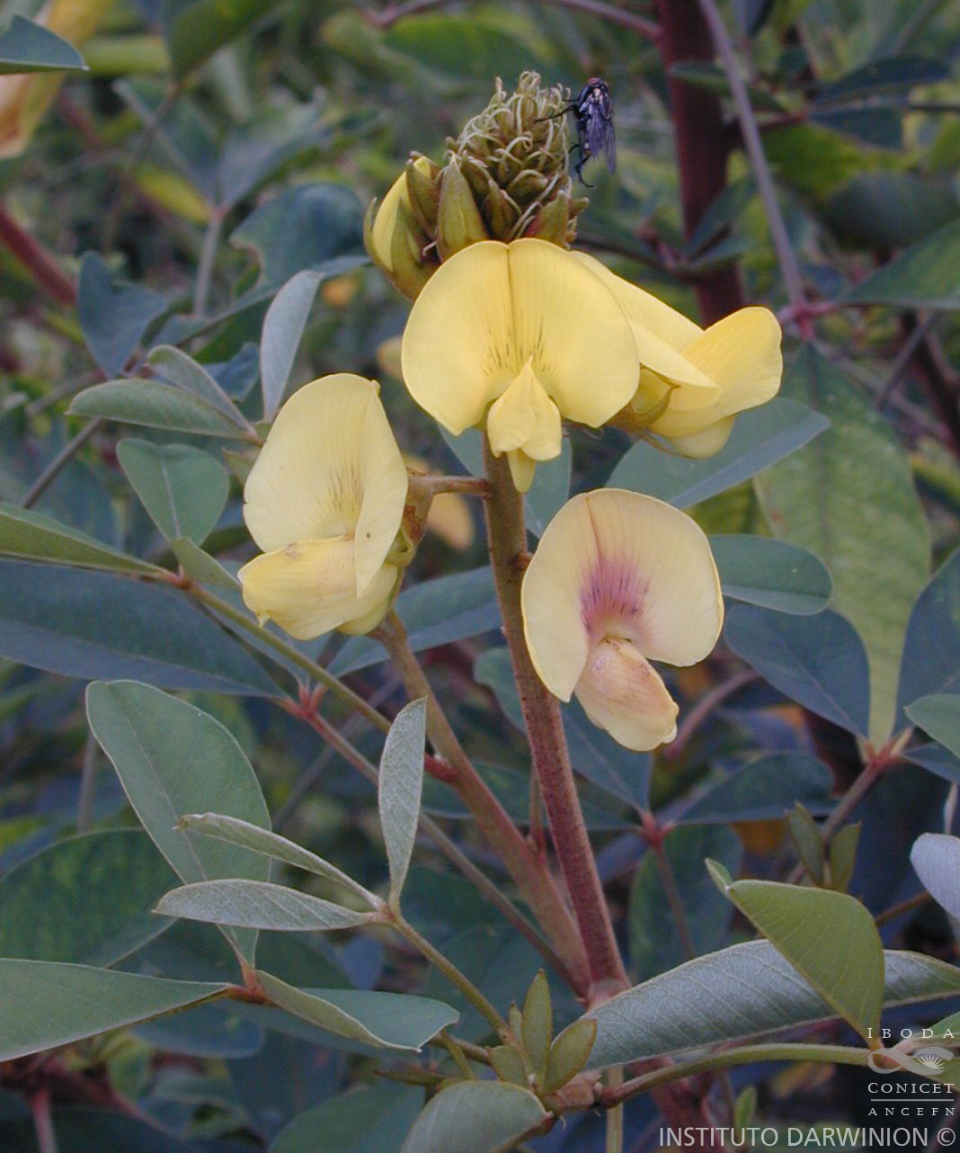 Arbusto 0,60-3 m alto, con pubescencia amarillento-broncinea, notable en los organos jovenes. Hojas trfolioladas; foliolos 2-8 cm long. x 1-2,7 cm lat., oblanceolados a elipticos con base angostada, discolores, glabros en la superficie adaxial, estrigoso en la abaxial, estipulas bracteas y bracteolas caducas. Racimos robustos, apicales 10-30 cm long.; antes de la florescencia bracteas y bracteolas pubescentes, crespas. Pedunculos de 3-5 cm long., flores amarillo-limon, 1,5-2 cm long., caliz persistenmte, ca. 1,2 cm long., lobulos mayores que el tubo, los 4 superiores unidos de a pares por sus apices, el lobulo inferior libre; estandarte con apendices o callos, unea corta, carnosa, lanosa; alas rectangulares mayor que la quilla rostrada, esta con borde superior y uña lanosa; ovario estipitado, estilo geniculado , pubescencia distal y circunsestigmatica. Legumbre 2-3 cm long. x 1-1,5 cm lat; estípite de 6-7 mm long., oblonga, inflada, rostrada, pubescente. Semillas 0,4-0,5 cm diam., numerosas, casatño oscuras, lustrosas, reniforme, seno hilar profundo.