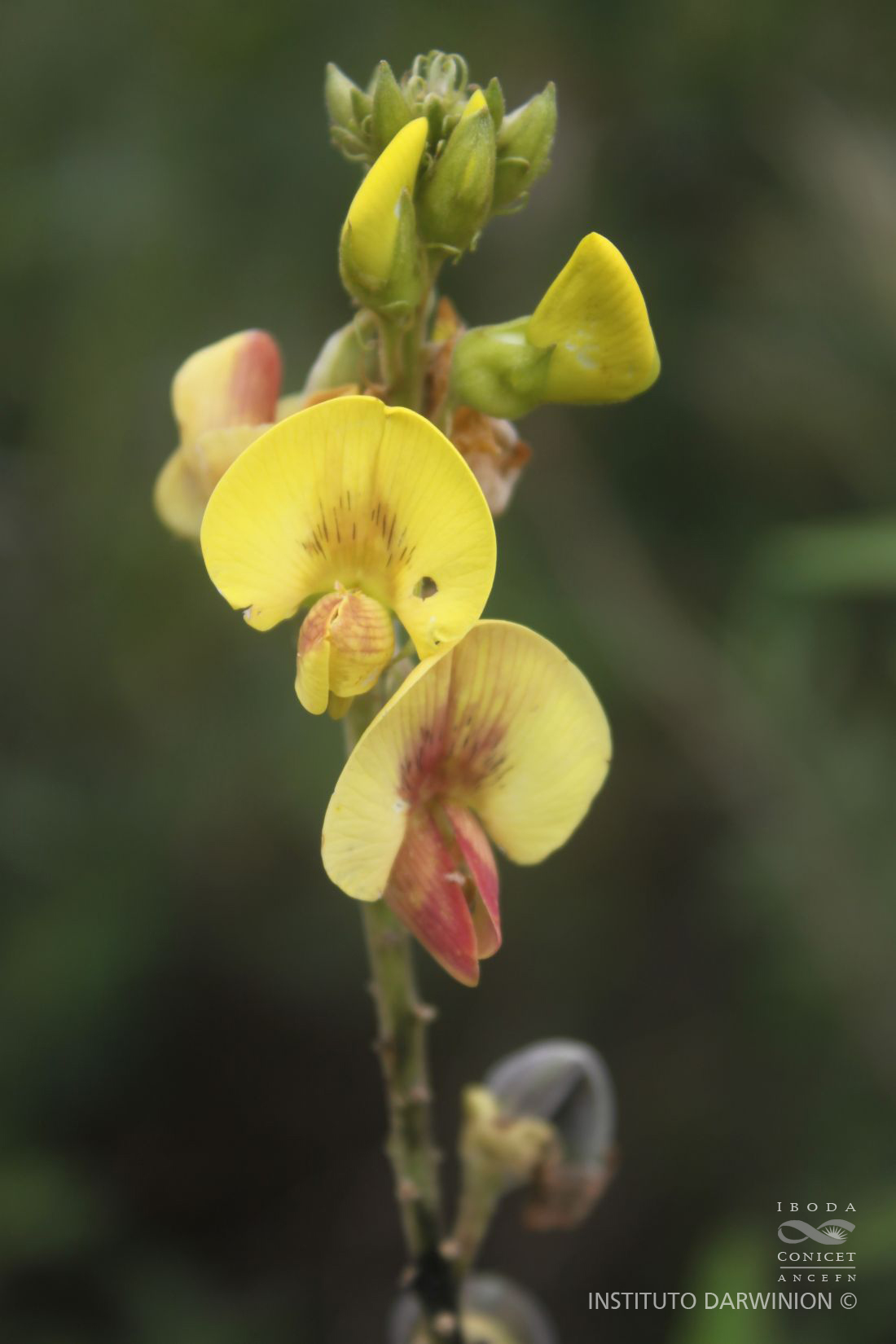 Arbusto 0,60-3 m alto, con pubescencia amarillento-broncinea, notable en los organos jovenes. Hojas trfolioladas; foliolos 2-8 cm long. x 1-2,7 cm lat., oblanceolados a elipticos con base angostada, discolores, glabros en la superficie adaxial, estrigoso en la abaxial, estipulas bracteas y bracteolas caducas. Racimos robustos, apicales 10-30 cm long.; antes de la florescencia bracteas y bracteolas pubescentes, crespas. Pedunculos de 3-5 cm long., flores amarillo-limon, 1,5-2 cm long., caliz persistenmte, ca. 1,2 cm long., lobulos mayores que el tubo, los 4 superiores unidos de a pares por sus apices, el lobulo inferior libre; estandarte con apendices o callos, unea corta, carnosa, lanosa; alas rectangulares mayor que la quilla rostrada, esta con borde superior y uña lanosa; ovario estipitado, estilo geniculado , pubescencia distal y circunsestigmatica. Legumbre 2-3 cm long. x 1-1,5 cm lat; estípite de 6-7 mm long., oblonga, inflada, rostrada, pubescente. Semillas 0,4-0,5 cm diam., numerosas, casatño oscuras, lustrosas, reniforme, seno hilar profundo.
