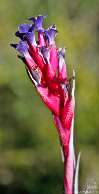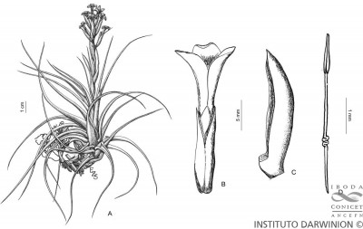 Planta caulescente, en flor de 9-35 cm de altura, Hojas de 4-14 x 1 cm, de ancho en la base, rosuladas, ensiformes, agudas, acanaladas, verde grisáceas. Inflorescencia apical en espiga, con 6 a 10 flores, escapo erecto, glabro, con bracteas imbricadas, rosadas, lepidotas; flores sésiles, con brácteas rosadas, de 16-20 x 6-9 mm, ovadas, atenuadas en el ápice, subinfladas, glabras. Sépalos membranáceos, blanquzcos o rosáceos, de 12-19 x 04 mm, glabros, agudos, el anterior libre, los dos posteriores connados desde la base, ápices libres, aquillados, acuminados. Pétalos elípticos, azul-viólaceos, de 17-27 mm de largo. Estilo delgado, más largo que el ovario. Estambres incluidos, de 1,2 cm, de largo, filamentos plegados. Cápsula de 2 cm, subprismática, con numerosas semillas.