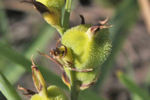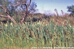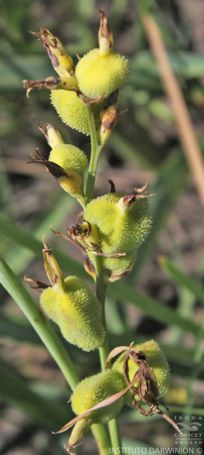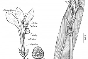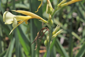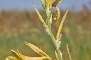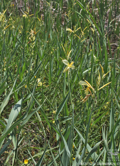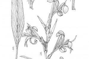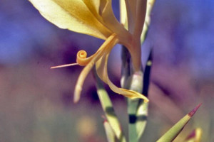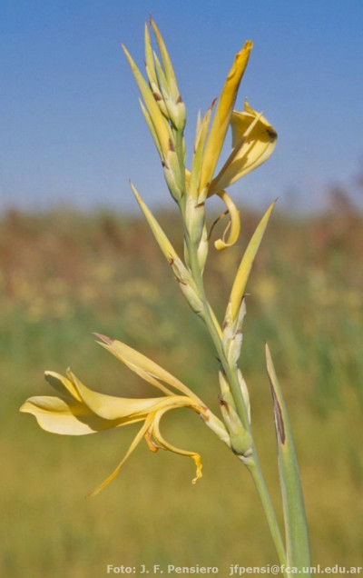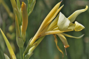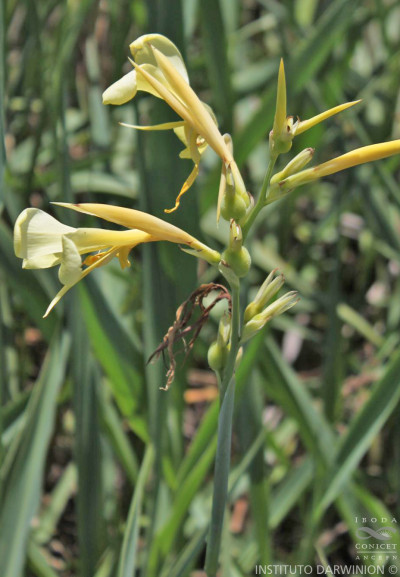 Plantas vigorosas con rizomas de entrenudos cortos y tallos aéreos de (0,8) 1,5-1,8 (2,0) m alt. Lámina foliar angostamente lanceolada, con base y ápice atenuados, glabras, color verde glauco, de 30-50 cm alt. por 5-15 cm lat. Inflorescencia racemi-forme, simple, con bráctea basal envainadora de hasta 20 cm long. Flores sésiles o subsésiles, amarillas; sépalos triangular-lanceolados, de 13-17 mm long.; pétalos con porción basal tubulosa, hasta la mitad de su longitud, de 40-60 mm long.; estaminodios 3, soldados en su cuarto a mitad inferior, labelo escotado, bilobado o emarginado, los restantes redondeados, de hasta 80 mm long. y 15-20 mm lat. Cápsula oblonga, papilosa, de 30- 40 mm long. Semillas esféricas, negras o marrón oscuro, de 6-7 mm diám. La variedad tipo se caracteriza por sus flores amarillas con sépalos pequeños (13-15 mm) y sus hojas con lámina relativamente ancha (4-13 cm lat.).