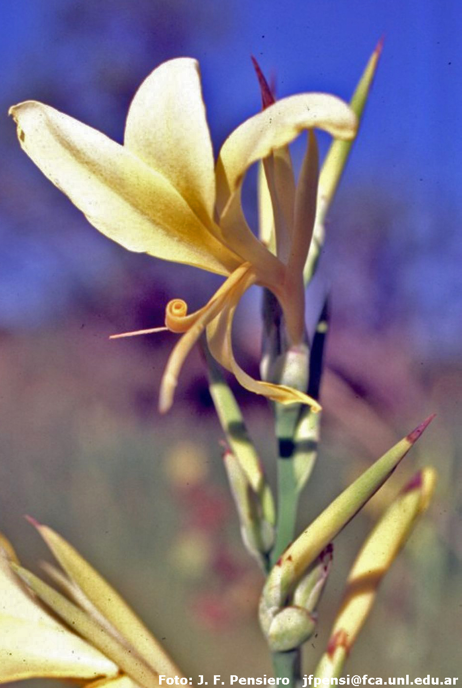 Plantas vigorosas con rizomas de entrenudos cortos y tallos aéreos de (0,8) 1,5-1,8 (2,0) m alt. Lámina foliar angostamente lanceolada, con base y ápice atenuados, glabras, color verde glauco, de 30-50 cm alt. por 5-15 cm lat. Inflorescencia racemi-forme, simple, con bráctea basal envainadora de hasta 20 cm long. Flores sésiles o subsésiles, amarillas; sépalos triangular-lanceolados, de 13-17 mm long.; pétalos con porción basal tubulosa, hasta la mitad de su longitud, de 40-60 mm long.; estaminodios 3, soldados en su cuarto a mitad inferior, labelo escotado, bilobado o emarginado, los restantes redondeados, de hasta 80 mm long. y 15-20 mm lat. Cápsula oblonga, papilosa, de 30- 40 mm long. Semillas esféricas, negras o marrón oscuro, de 6-7 mm diám. La variedad tipo se caracteriza por sus flores amarillas con sépalos pequeños (13-15 mm) y sus hojas con lámina relativamente ancha (4-13 cm lat.).
