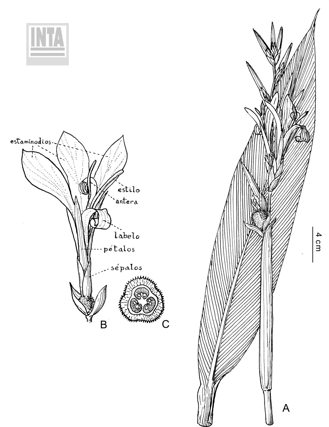 Plantas vigorosas con rizomas de entrenudos cortos y tallos aéreos de (0,8) 1,5-1,8 (2,0) m alt. Lámina foliar angostamente lanceolada, con base y ápice atenuados, glabras, color verde glauco, de 30-50 cm alt. por 5-15 cm lat. Inflorescencia racemi-forme, simple, con bráctea basal envainadora de hasta 20 cm long. Flores sésiles o subsésiles, amarillas; sépalos triangular-lanceolados, de 13-17 mm long.; pétalos con porción basal tubulosa, hasta la mitad de su longitud, de 40-60 mm long.; estaminodios 3, soldados en su cuarto a mitad inferior, labelo escotado, bilobado o emarginado, los restantes redondeados, de hasta 80 mm long. y 15-20 mm lat. Cápsula oblonga, papilosa, de 30- 40 mm long. Semillas esféricas, negras o marrón oscuro, de 6-7 mm diám. La variedad tipo se caracteriza por sus flores amarillas con sépalos pequeños (13-15 mm) y sus hojas con lámina relativamente ancha (4-13 cm lat.).