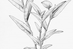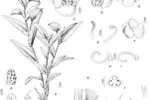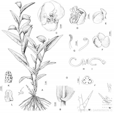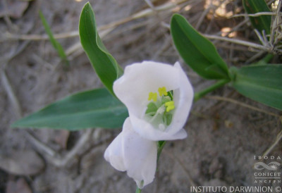 Hierba perenne, cespitosa, de raíces gruesas, fasciculadas. Tallos finamente pubérulos, con tricomas simples, 2-3 celulares, a casi glabros. Hojas sésiles de vaina pubescente o casi glabra, con aurículas abrazadoras, de bordes pubérulos a glabros, atenuadas o ausentes en las hojas de nudos superiores, lámina foliar de 4-8,5(-12) × 8-1,6(-2) cm, glabra, angostamente elíptica, lanceolada u oblonga, ápice agudo o acuminado, casi siempre obtuso en hojas basales. Tallos floríferos en general con 1-4 o más inflorescencias, de pedúnculo pubescente y espata glabra, anchamente ovada, conduplicada, de 1,5-3 ×1-1,6 cm, ápice agudo, y bordes libres apenas unidos en la base, con mucílago en su interior, inflorescencia con cincino basal ausente y cincino apical 3-4-floro, raquis con pelos claviformes. Cáliz de sépalos libres, con pelos 3-celulares, claviformes, en la base de la cara dorsal, en la unión con el pedicelo y en el ápice del sépalo dorsal, sépalos internos transverso-ovados, de 5,2 mm de diámetro mayor, sépalo ventral navicular, ovado, de 4 mm de largo. Pétalos blancos o con tinte lilacino, los laterales transverso-ovados, de 14-15 mm de ancho, con uña breve, de 2,5-3 mm de largo, pétalo ventral de 11 mm de ancho. Estambres 6, de filamentos blanco-hialinos, los 3 dorsales estériles, con anteras amarillas, cruciformes, de brazos cortos, gruesos y los 3 ventrales fértiles con polen blanco-lila. Estilo reflejo, de ápice incurvo, dibujando casi una circunferencia, blanco hialino o lila pálido; ovario verde hialino, 5-ovulado, con pelos claviformes, glandular-mucilaginosos. Cápsula 2-valvar, 4-seminada, de valva ventral retro-refleja, persistente y valva dorsal caediza, indehiscente, a veces con una semilla. Semillas subcilíndricas, de 3,3-4,5 mm de largo, finamente farináceas, reticulado-foveoladas, fovéolas centradas por sendas fositas.