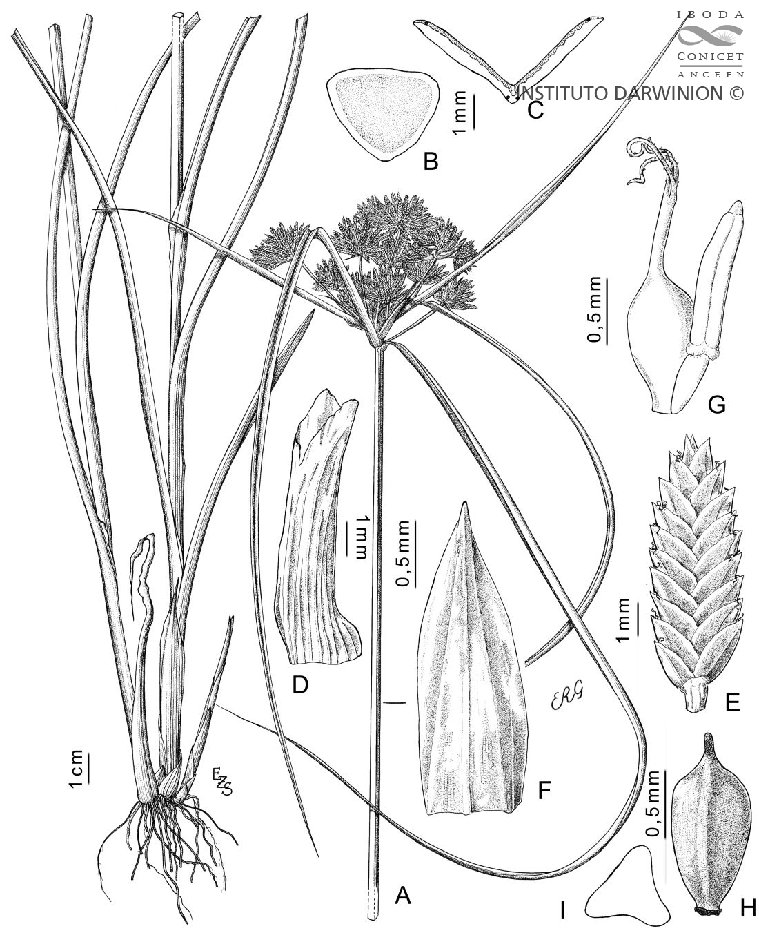 Rizoma cespitífero. Tallos triangulares, lisos, de ángulos obtusos, de 15-60 cm de alto. Hojas del largo del tallo, de 4-8 mm de ancho, ligeramente escabrosas en los bordes. Inflorescencia en antela más o menos desarrollada, a veces contraída; radios 7-9 en las formas robustas, en que pueden llegar a 10 cm; radios secundarios dispuestos en corimbo; umbelas secundarias contraídas a veces en glomérulos; espiguillas linear-lanceoladas de 11-15 x 2-2,5 mm con 18-30 flores. Estambre único. Estigmas 3. Aquenio obovoide, trígono, atenuado en la base en estípite corto de color purpúreo, así como el mucrón, de 1,1-1,4 mm.