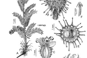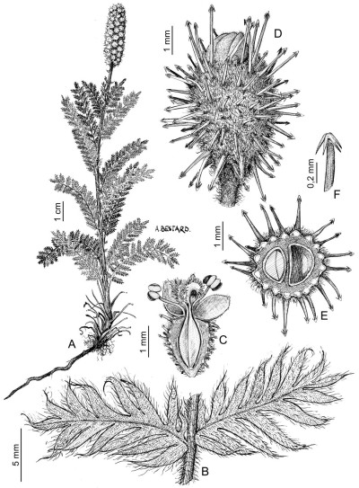 Hierbas hasta de 0,8 m de alto, rizomatosas; tallo decumbente o suberecto, entrenudos extensos, no cubiertos por las vainas foliares. Hojas pecioladas, imparipinnadas, de 4-12 cm de largo; folíolos en 7-15 pares, con lámina elíptica u oblongo-elíptica, de 0,8-1,8 cm de largo, margen pinnatisecto con segmentos lineares o linear-lanceolados, serícea en ambas caras; vainas foliares seríceas; apéndices estipulares de 3-6 mm de largo. Inflorescencia cilíndrica, terminal, de 2,5-3,5 cm de largo; brácteas lineares, oblongas u ovadas; pedúnculo piloso. Flores casmógamas con 4-5 sépalos, elípticos u orbiculares, de 1,2-1,8 mm de largo, cara dorsal serícea, la ventral glabra; estambres 3-5, anteras orbiculares, de 0,5-0,8 mm de largo; pistilos 2-4. Flores cleistógamas similares a las casmógamas, dispuestas en la base de las ramas floríferas o en la axila de las hojas. Cupela elipsoidal u orbicular, de 5-8 mm de largo, lanosa o tomentosa; espinas numerosas en toda la superficie, el ápice gloquidiado; aquenios 2-4.