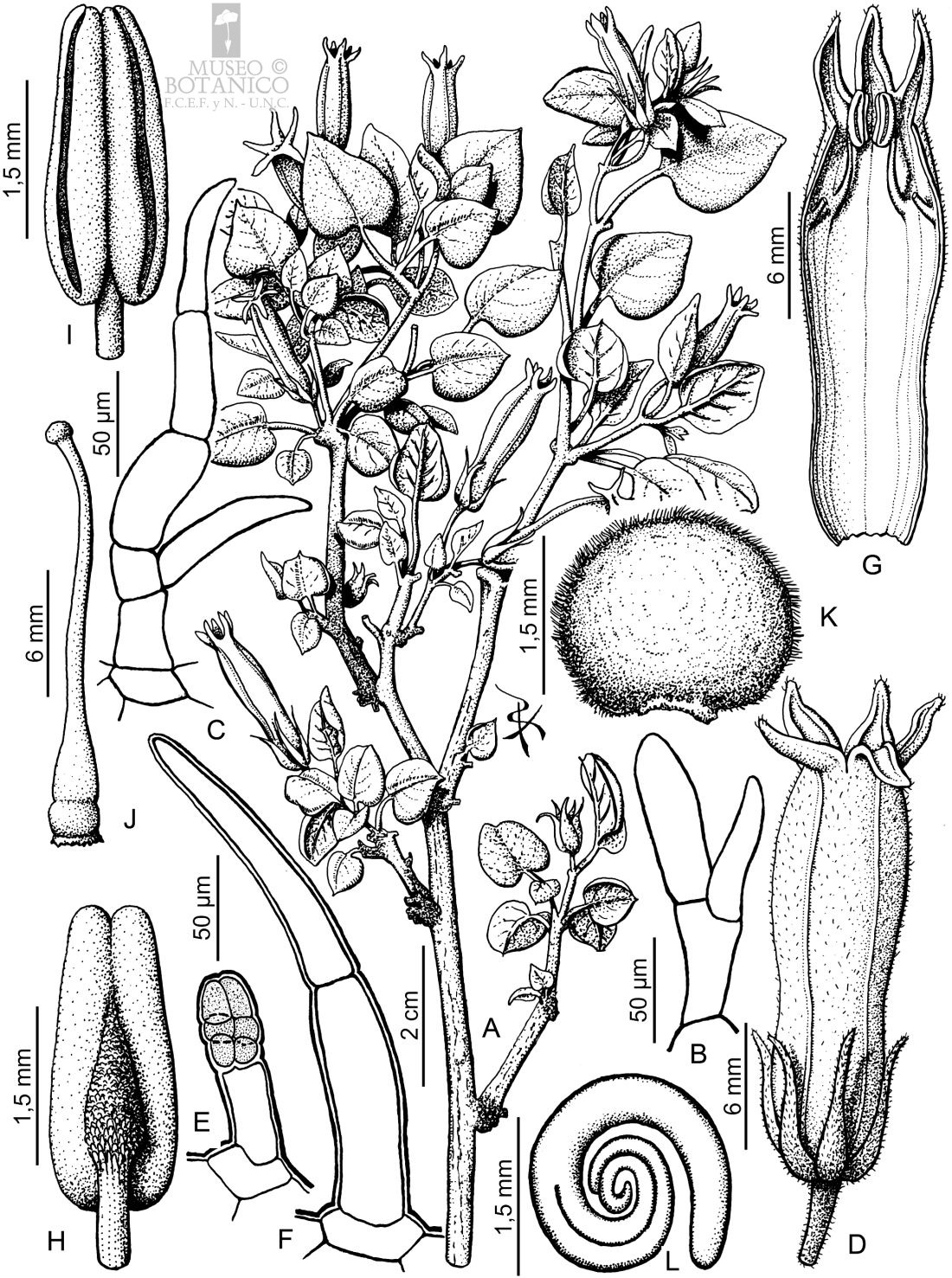 A. Rama florífera. B-C. Tricomas eglandulares bifurcados de hoja. D. Flor. E. Tricoma glandular del cáliz. F. Tricoma eglandular del cáliz. G. Sector de corola desplegada. H. Estambre, vista dorsal. I. Estambre, vista ventral. J. Gineceo. K. Semilla. L. Embrión.