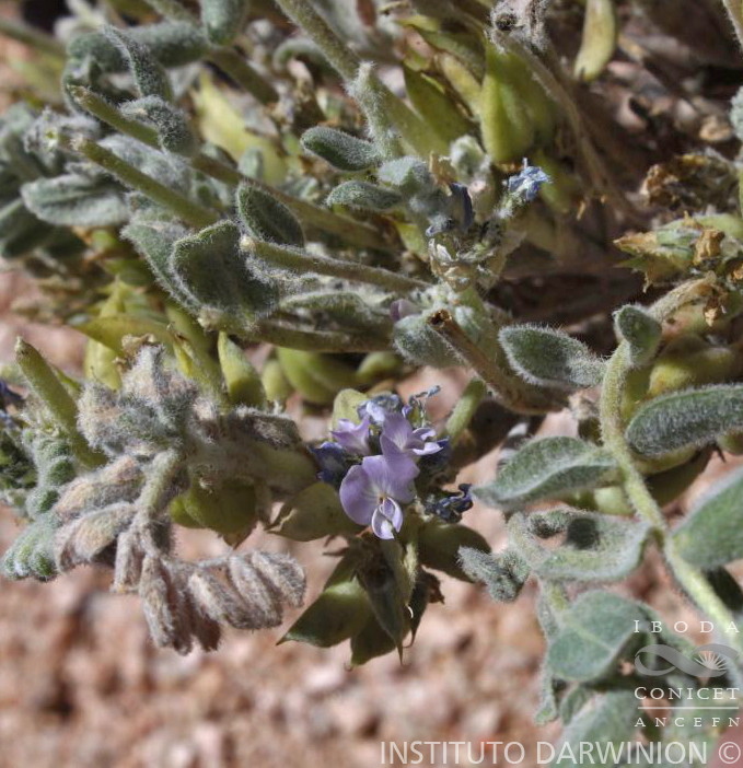 Hierba baja, cespitosa, laxamente pulvinada, pubescencia tomentosa-villosa. Hojas imparipinadas de (6-) 8-12 cm long., incluído el pecíolo de (2-) 3-8 cm long.; folíolos de 8,5-12 mm long. x 5-7 mm lat, elíptico cuneados, ápice obtuso a truncado retuso, villoso-pubescentes, generalmente sólo en la superficie abaxil. Pedúnculos mucho más cortos que las hojas, 6-9 –floros. Flores de 7,5-10 mm long, corola azul-violácea, escepcionalmente blanca; ovario pubescente. Fruto legumbre, falcada de 1,5-2 cm long. x 0,5 cm lat; interiormente el falso tabique con reborde membranoso, hacia la base puede llegar hasta la sutura placentar, el pedunculo conspicuamente incurvo deposita el fruto sobre la tierra, donde madura. Semillas, ca. 9.