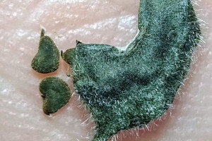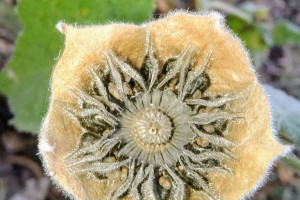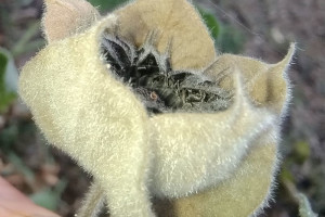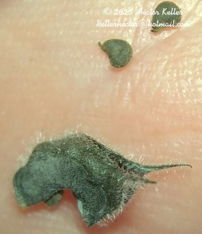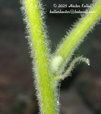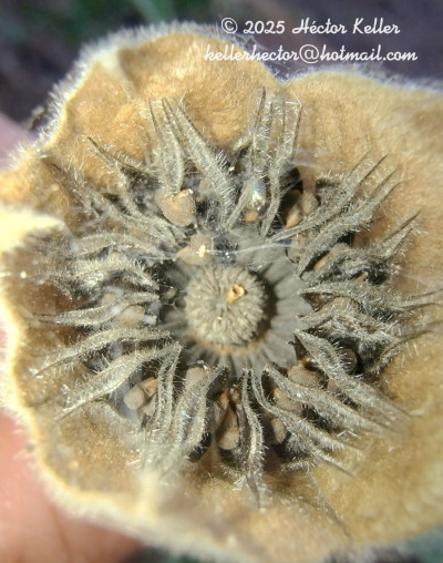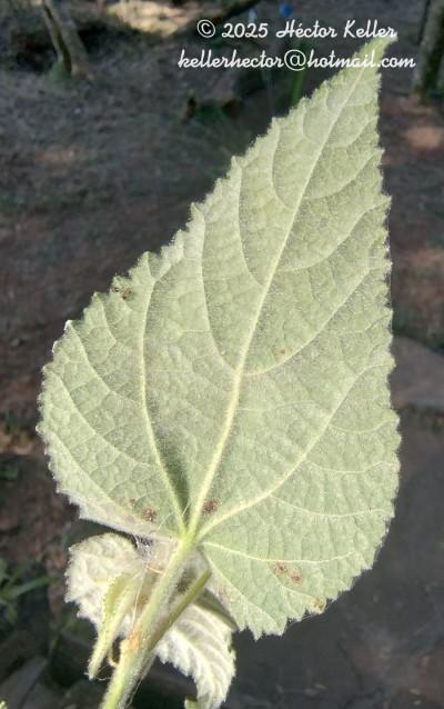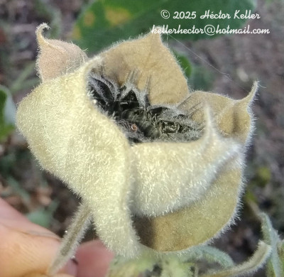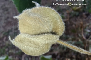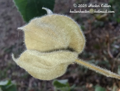 Subarbusto de 1 a 1,70 m de altura, erecto. Tallos velutinos, los pelos estrellados dejan ver algo la epidermis. Estípulas persistentes, filiformes, de 9 mm de largo. Pecíolos más breves que la lámina, de 2-5 cm de largo, aterciopelados. Lámina discolor, hasta de 9,5 × 5 cm, subtriangular, aovado alargada, de base cordada, seno cerrado, ápice agudo, margen crenado, 5-7-palmatinervada ; haz aterciopelado, con pelos estrellados algo esparcidos y con algunos pelos simples glandulosos; envés ceniciento, aterciopelado, densamente cubierto de pelos estrellados. Flores solitarias, axilares, distribuidas a lo largo de las ramas. Pedúnculos de 6-8 cm de largo, gruesos, velutinos, articulados 1 a 2 cm por debajo de la flor. Cáliz velutino, densamente cubierto de pelos estrellados, pentágono-alado, dividido casi hasta la base en 5 lóbulos, acrescente; lóbulos acorazonados, 15 × 15 mm, en la antesis, seno basal de 3 mm de largo, cerrado, soldados entre sí ca. 3 mm basales, cara externa velutina, cara interna también, pero glabra hacia la base. Corola amarilla, del mismo largo o un poco más que el cáliz; tubo de la corola de 1 mm de largo, glabro; pétalos 10 × 9 mm, uña con pocos pelos. Tubo estaminal de 2 mm de largo, glabro, estambres numerosos, agrupados en el ápice del tubo. Ovario con 25 a 28 carpelos; óvulos 5, superpuestos, 1-seriados; estilos tantos como carpelos, de 4 mm de largo, porción soldada 1 mm, cubierta por el ápice del ovario; estigmas capitados, con algunos pelos en el ápice. Fruto envuelto por el cáliz acrescente, lóbulos del cáliz hasta de 30 × 27 mm. Carpidios negros a la madurez, de 12 mm de largo, (incluidas las aristas apicales) × 6 mm de ancho, aristas de 2 mm de largo, hacia la base, en el dorso, puede haber o no dos espinas incipientes. Cara externa cubierta de pelos estrellados, excepto la parte de las caras laterales donde se adosa con los carpidios contiguos, dehiscentes desde el ápice hasta el nacimiento de la lengüeta interna, a partir de allí indehiscente y en esta última porción las paredes laterales presentan un reticulado muy tenue, cara interna con cortos pelos estrellados sobre el nervio medio y en el margen de las paredes, que no está en contacto con las semillas; a la madurez el nervio medio se separa en la base de los carpidios, manteniendo a éstos unidos al eje del fruto. Semillas 5, uniseriadas, superpuestas, piriformes, con cortos pelos esparcidos.