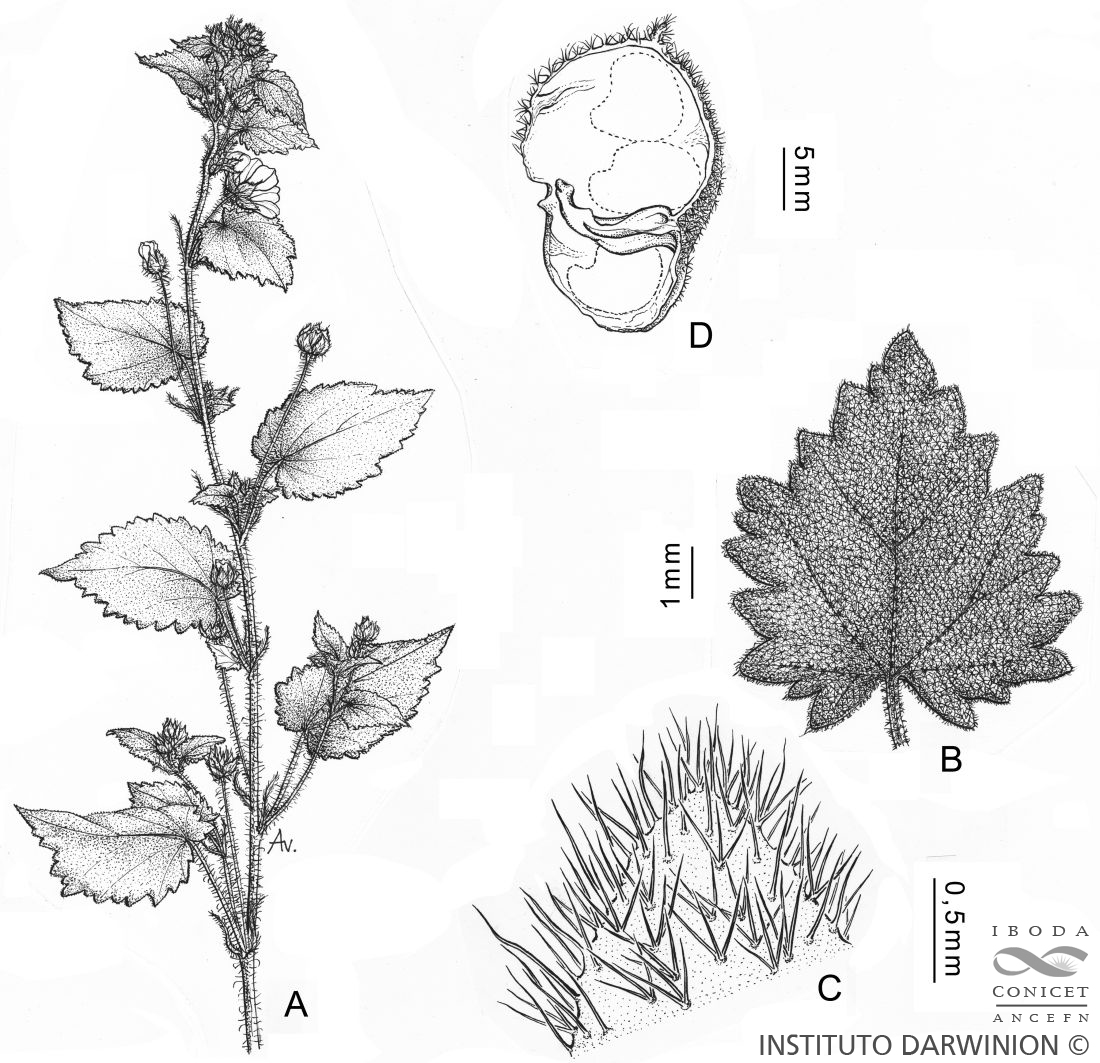 Arbustos de 0,5-2 m de altura, los tallos estrellados-puberulosos. Pelos simples de 1-3 mm de largo. Hoja hojas 3-8 (-13) × 2,5-6 (-10) cm, ovadas, base cordada, aserrada, acuminada, 5-7-palmatinervada, concoloras, densamente pubescente, pecíolos 1-3 cm de largo, con pubescencia como la del tallo. Estípulas de 7-12 mm de largo, lineal, ciliadas. Flores solitarias en las axilas de las hojas, a veces geminadas, a menudo agregadas en una inflorescencia terminal más o menos por encima de las hojas. Pedicelos 1,5-3 cm de largo con pubescencia como la del tallo. Cáliz de 7-8 mm de largo, medio dividido, estrellado-pubescente y piloso. Pétalos de 8 a 11 mm de largo, amarillentos a blanquecinos, pubescentes en los márgenes. Columna estaminal de 2-3 mm de largo, los filamentos de 1,5 mm de largo. Estilos 7-9, exertos de la columna estaminal. Frutos con pelos estrellados (y con glándulas), de 8-9 mm de diámetro, superando el cáliz. Mericarpios 7-9, apiculados (apículo de 1 mm de largo), 6-7 mm de largo, 3 semillas, con una endoglosa cubriendo. Semillas de 1,5-2 mm de largo.