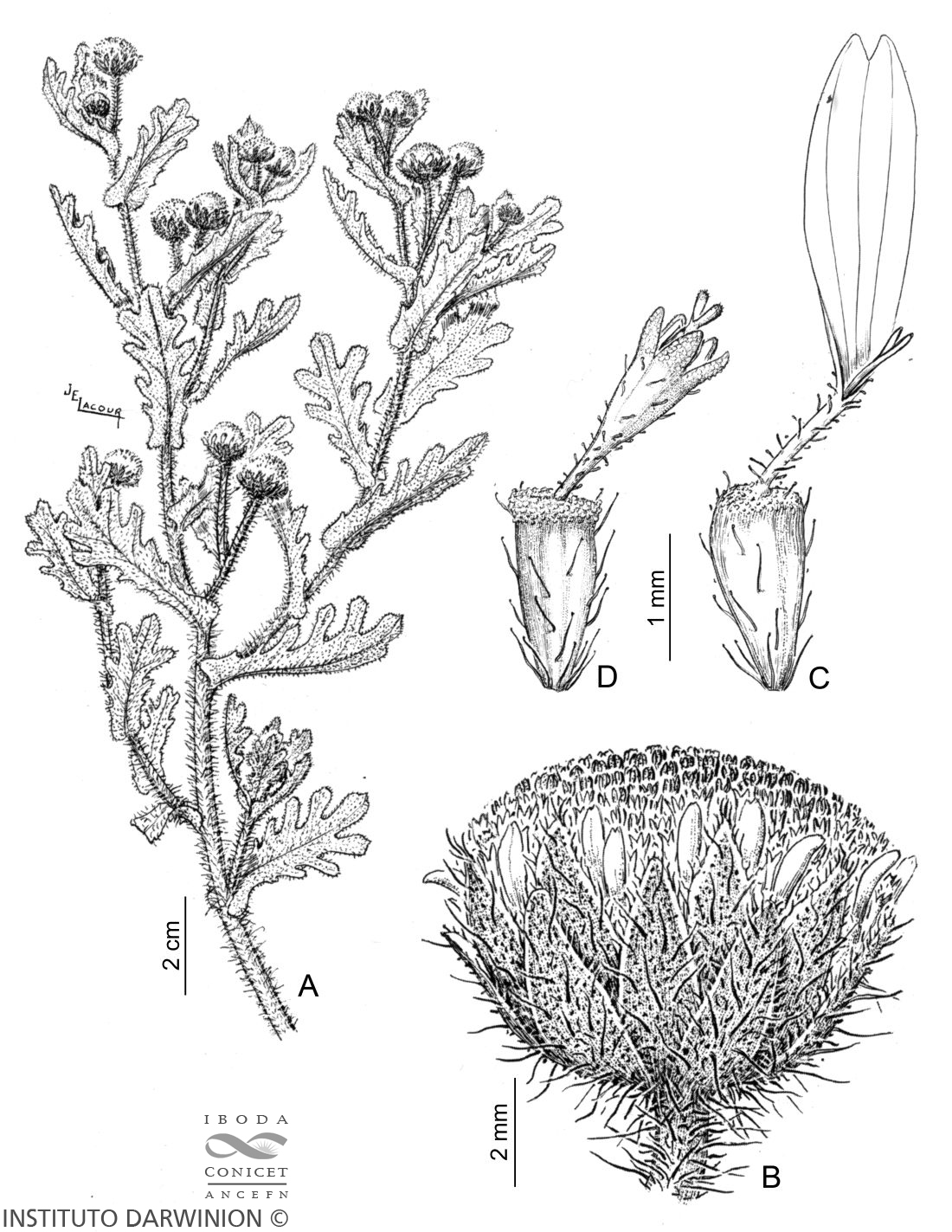 Hierbas anuales, con raiz principal desarrollada, hasta de 40 cm de alto, con tallos ramificados desde la base, hojosos, ramas erectas o postradas, hirsutas y glandulosas. Hojas obovadas, las inferiores, de 2,5-6 × 1-4 cm, las superiores gradualmente menores y menos lobadas; base cuneada, abrazadora, ápice obtuso, margen lobado-dentado o lirado-pinnatífido, glandulosas. Capítulos cortamente radiados, de 4-7 × 5-7 mm, pedunculados, solitarios o en corto número (2-3). Involucro hemisférico, con filarios subiguales, dispuestos en 2 series, de 3,5-4,5 × 1-1,5 mm, ovados, agudos, glandulosos y con pelos filiformes esparcidos. Flores del margen en 1 serie, con corola blanca, de 2,8-3 mm de largo, limbo corto, de 1,8-2,5 × ca. 0,5 mm; flores del centro con corola de 1-1,5 mm de largo. Aquenios ca. 1,2 × 0,5 mm, glabros, algo glandulosos. Papus ausente o formado por una coronita escariosa fimbriada.