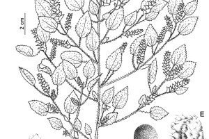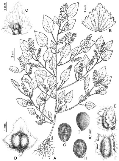 Hierba anual de 10-40 cm de alto, erecta; tallos simples o poco ramificados, con tricomas de tres tipos: simples, largos y rectos; cortos y encorvados, y glandulares. Hojas con pecíolo de 0,5-3 cm de largo, con indumento similar al de las ramas jóvenes; estípulas triangulares, de 2 mm de largo, pubescentes; lámina foliar ovado-lanceolada, de 1-5 × 0,8-3 cm, ápice agudo, base cordada o redondeada, margen aserrado; cara adaxial con algunos tricomas simples, hasta de 1 mm de largo, dispersos, patentes; cara abaxial con tricomas simples, patentes, y tricomas adpresos en los nervios; nerviación pinnatipalmada, con 3(-5) nervios en la base y 3-4 pares de nervios secundarios, membranácea. Inflorescencias 1-sexuales. Inflorescencias pistiladas espiciformes, cilíndricas, hasta de 8(-11) cm de largo, densifloras, terminales y axilares; brácteas subtriangulares a ovales, hasta de 9 × 9 mm, acrescentes en el fruto, pubescentes, con tricomas simples y glandulares, margen con 9-13 dientes menores a ¼ de la longitud de la bráctea. Inflorescencias estaminadas de 2-5 mm de largo, axilares, en cabezuelas, paucifloras, naciendo en la misma axila que las inflorescencias pistilidas, y algo ocultas por éstas. Flores pistiladas 1 o 2 por bráctea, sésiles; sépalos 3, ovados; ovario pubescente; estilos ramificados, plumosos. Flores alomórficas 2-3 en el ápice de las inflorescencias pistiladas. Fruto una cápsula; las que fructifican de las flores regulares, de 2 mm de diámetro, pubescente; las de las flores alomórficas con 3 breves alas o rebordes erosos. Semillas elipsoides, de 1,2-1,5 mm de largo, finamente foveoladas.