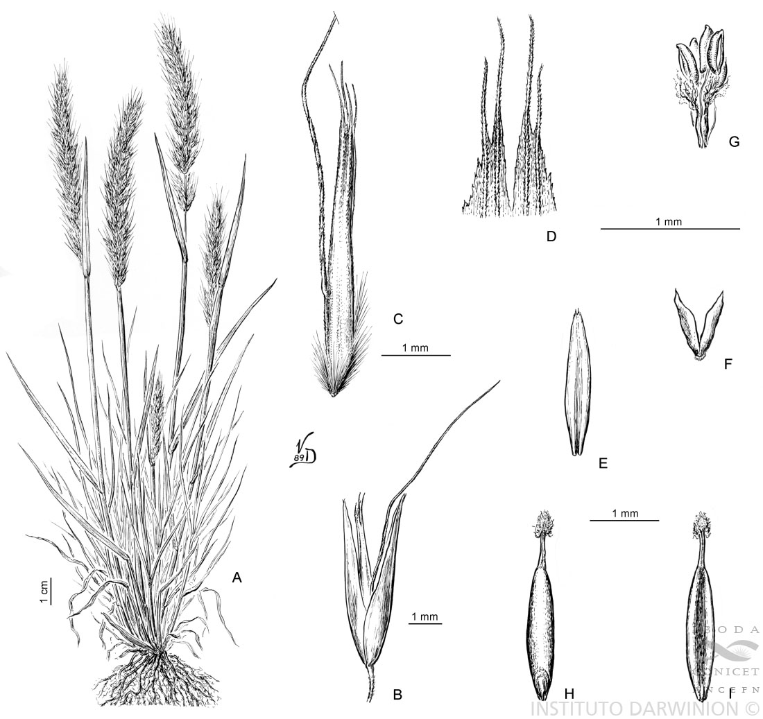 A. Planta. B. Espiguilla, vista lateral. C. Antecio, vista lateral. D. Ápice de la lemma. E. Pálea, vista dorsal. F. Lodículas. G. Androceo y gineceo. H. Cariopsis, vista escutelar. I. Cariopsis, vista hilar.