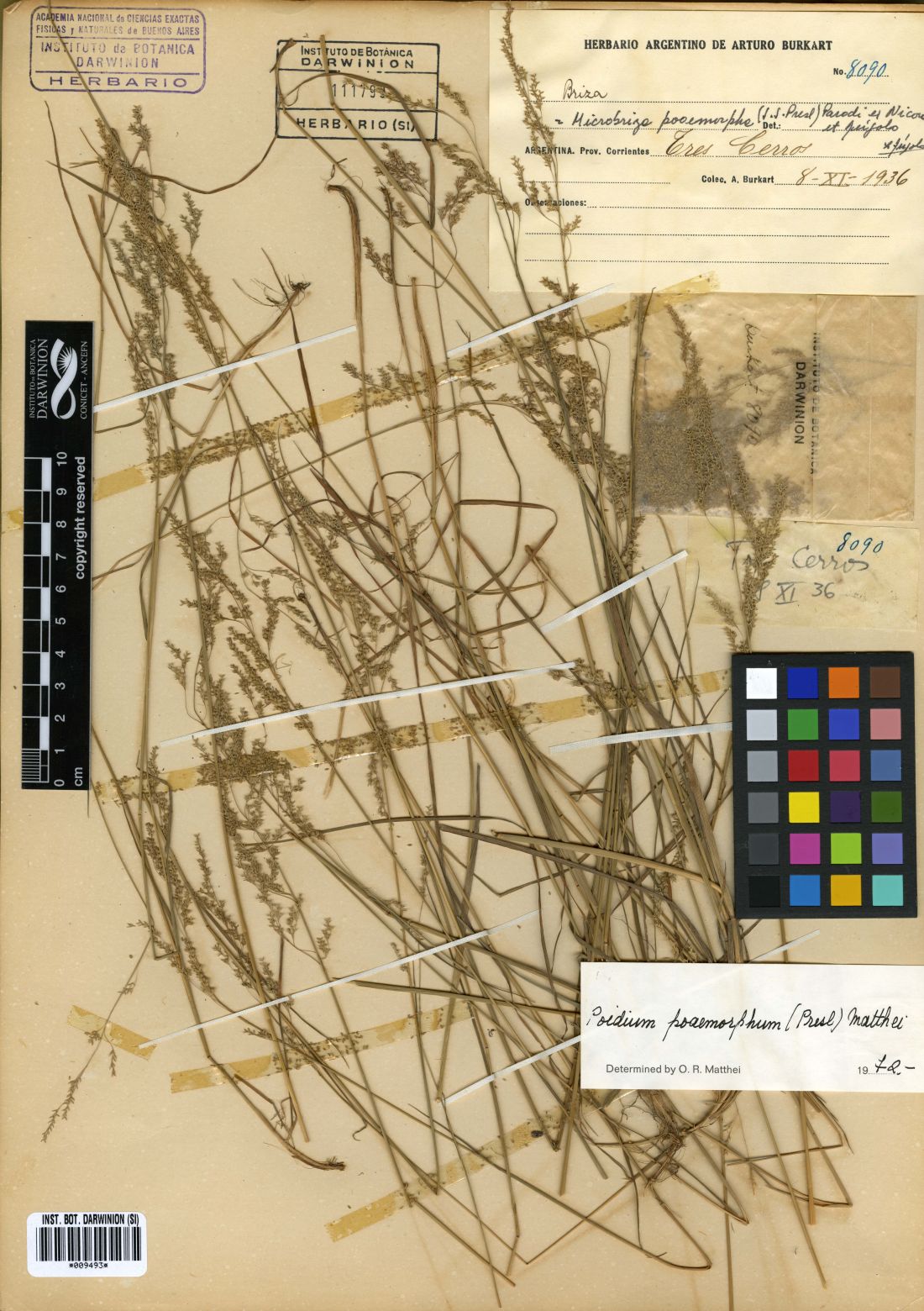 Observaciones: Nicora & Rúgolo de Agrasar (1981) señalan que Presl (1830) al describir Panicum poimorphum cita como localidad tipo Perú, sin embargo, esta especie no crece en dicho país. Probablemente se trate de un error de etiquetado y el material citado por el autor provenga de Uruguay, donde T. Haenke realizó sus primeras colecciones en América del Sur.
