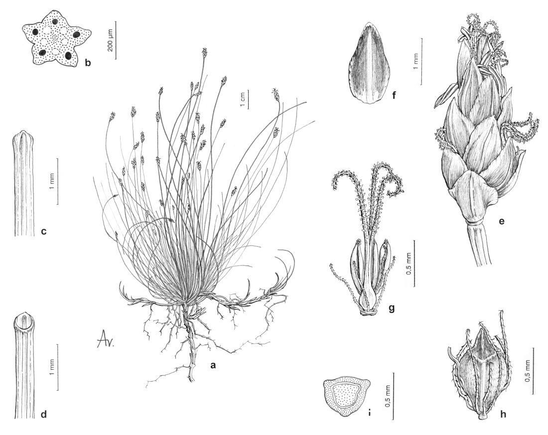 A. Planta. B. Sección transversal esquemática del tallo. C. Vaina foliar, cara dorsal. D. vaina foliar, cara ventral. E. Espiguilla. F. Gluma fértil. G. Flor. H. Aquenio. I. Transección esquemática del aquenio